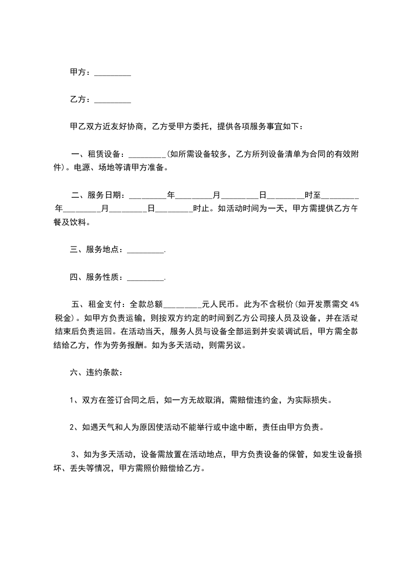 五、租金支付:全款总额_________元人民币。此为不含税价(如开发票需交4%税金)。如甲方负责运输,则按双方约定的时间到乙方公司接人员及设备,并在活动结束后负责运回。在活动当天,服务人员与设备全部运到并安装调试后,甲方需全款结给乙方,作为劳务报酬。如为多天活动,则需另议。
