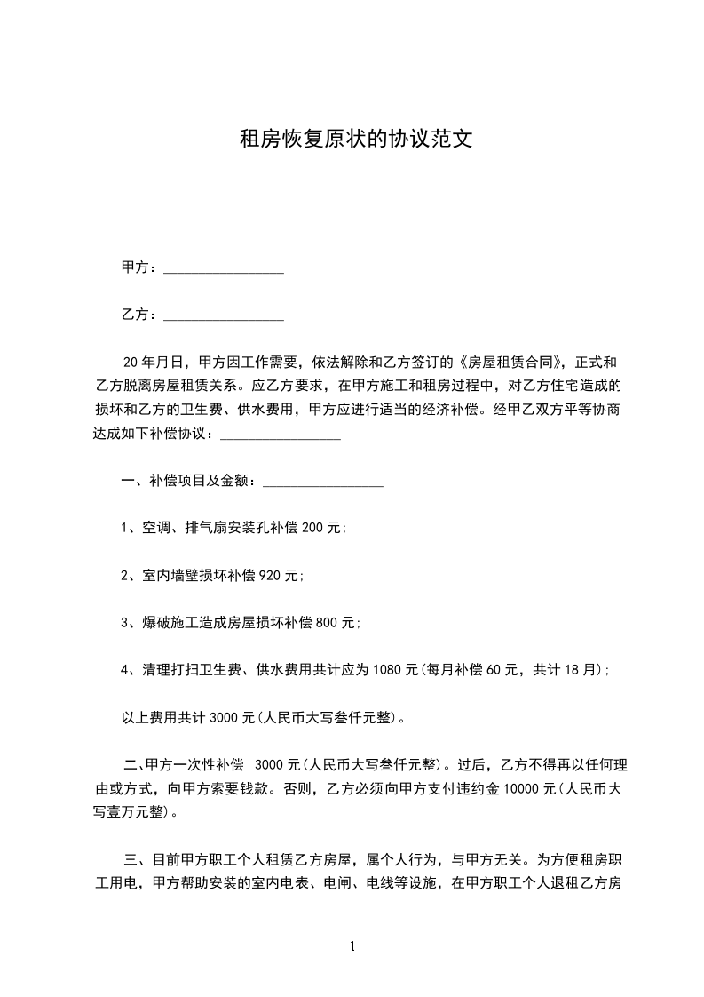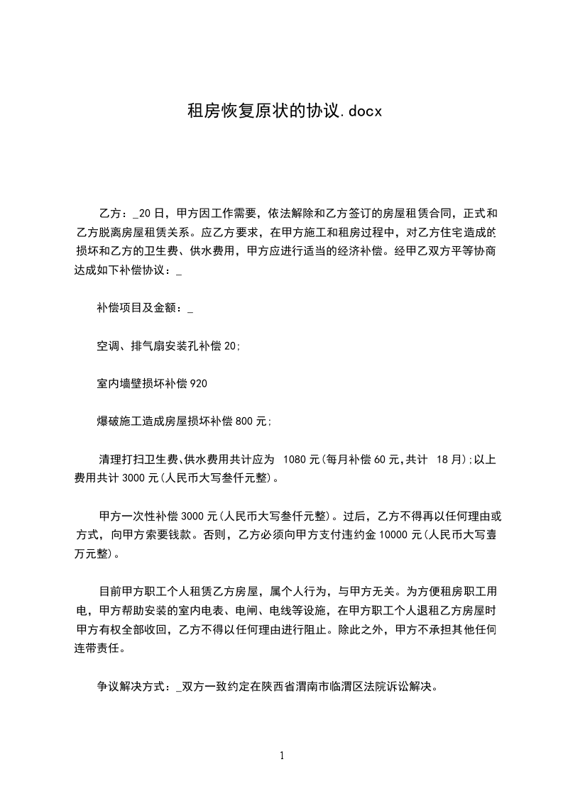 20_____年_____月_____日,甲方因工作需要,依法解除和乙方签订的《房屋租赁合同》,正式和乙方脱离房屋租赁关系。应乙方要求,在甲方施工和租房过程中,对乙方住宅造成的损坏和乙方的卫生费、供水费用,甲方应进行适当的经济补偿。经甲乙双方平等协商,达成如下补偿协议:_________________