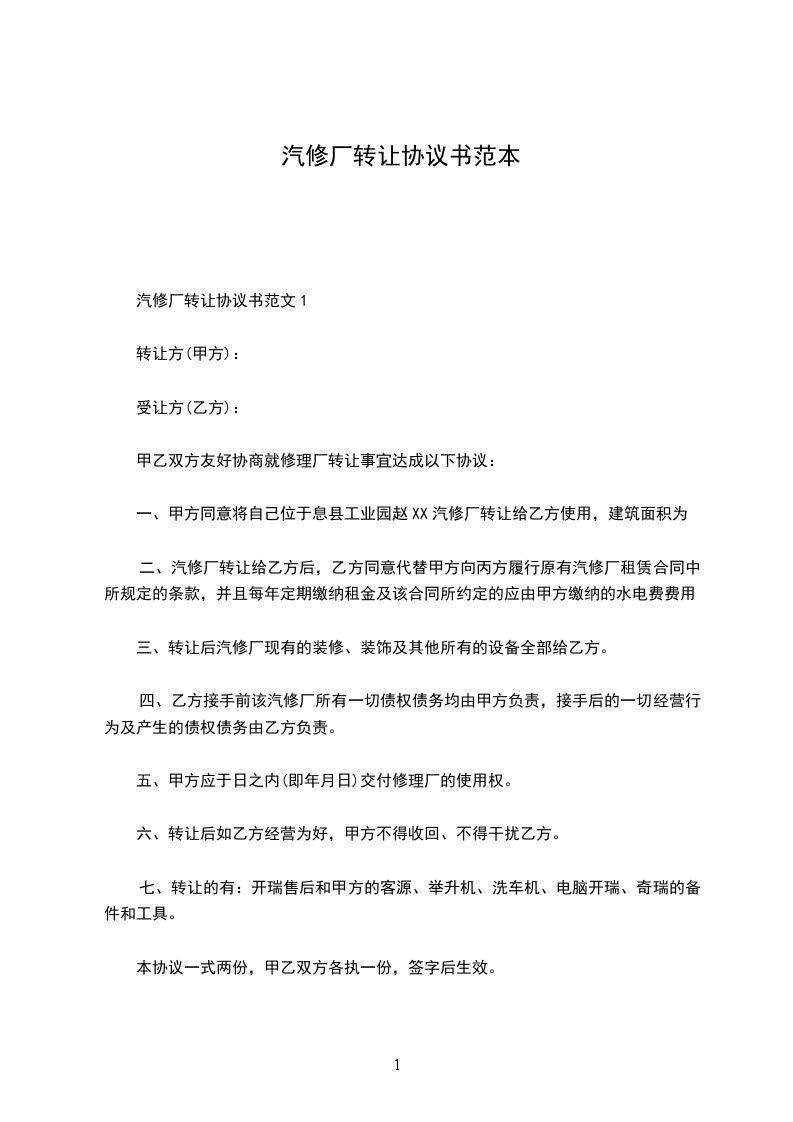 汽修厂转让协议书范文1