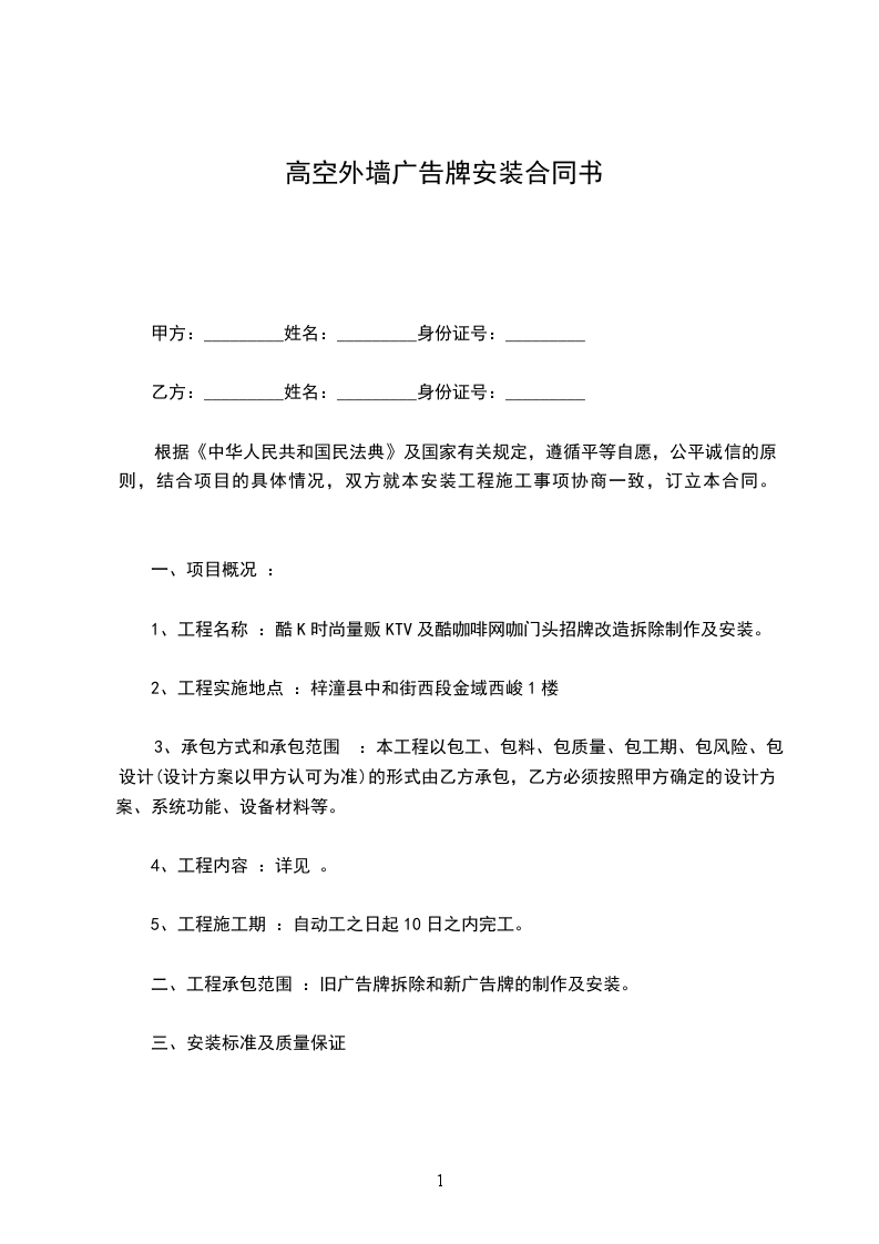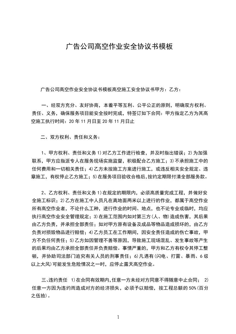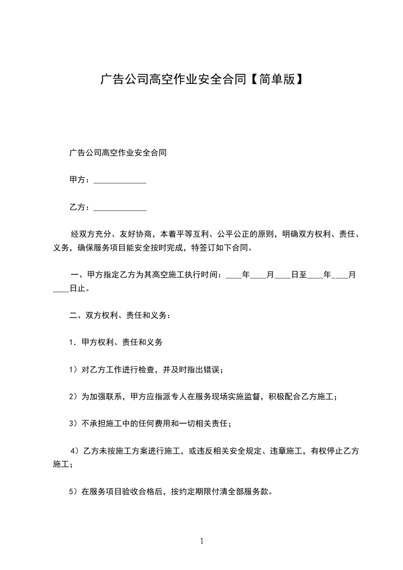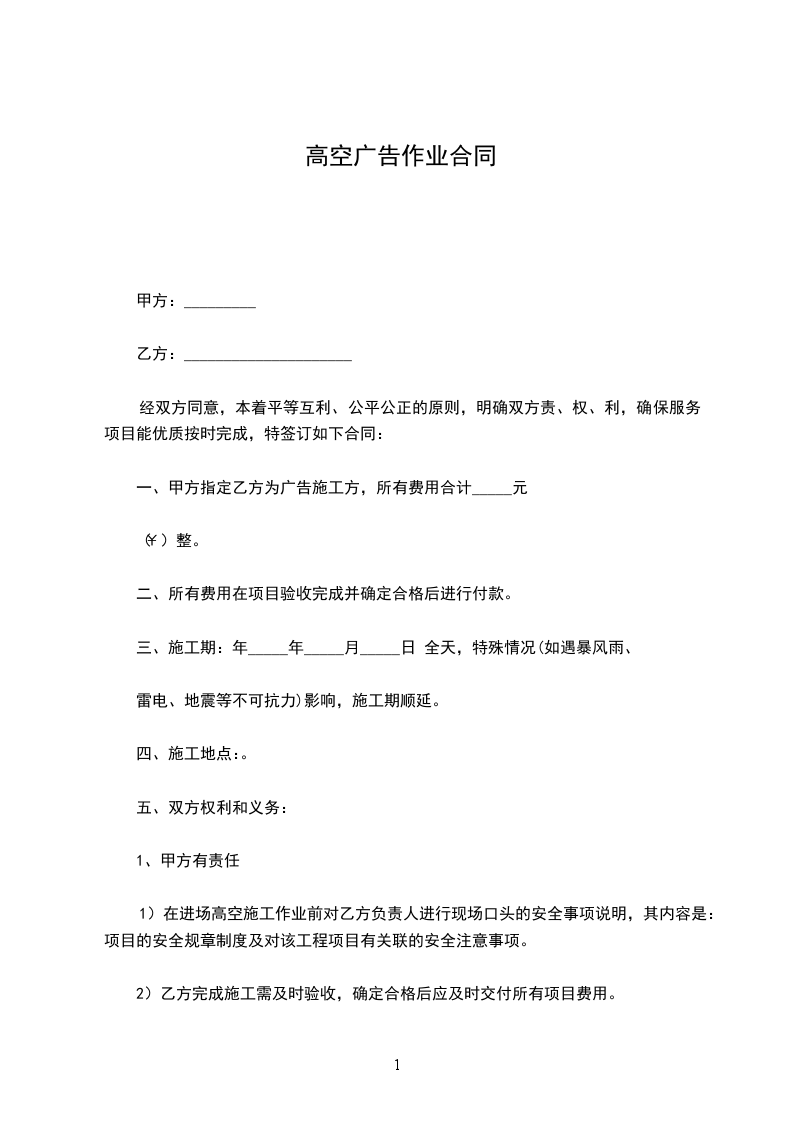 一、甲方指定乙方为其高空施工执行时间:____年____月____日至____年____月____日止。