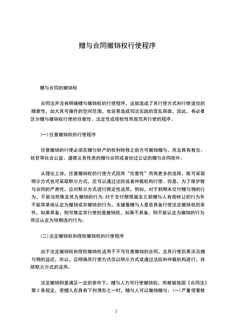 合同法并没有明确赠与撤销权的行使程序,这就造成了其行使方式和行使途径的随意性,加大其可操作的空间范围,也容易造成司法实践的混乱局面,因此,有必要区分赠与撤销权行使的任意性、法定性或授权性而规范其行使的程序。