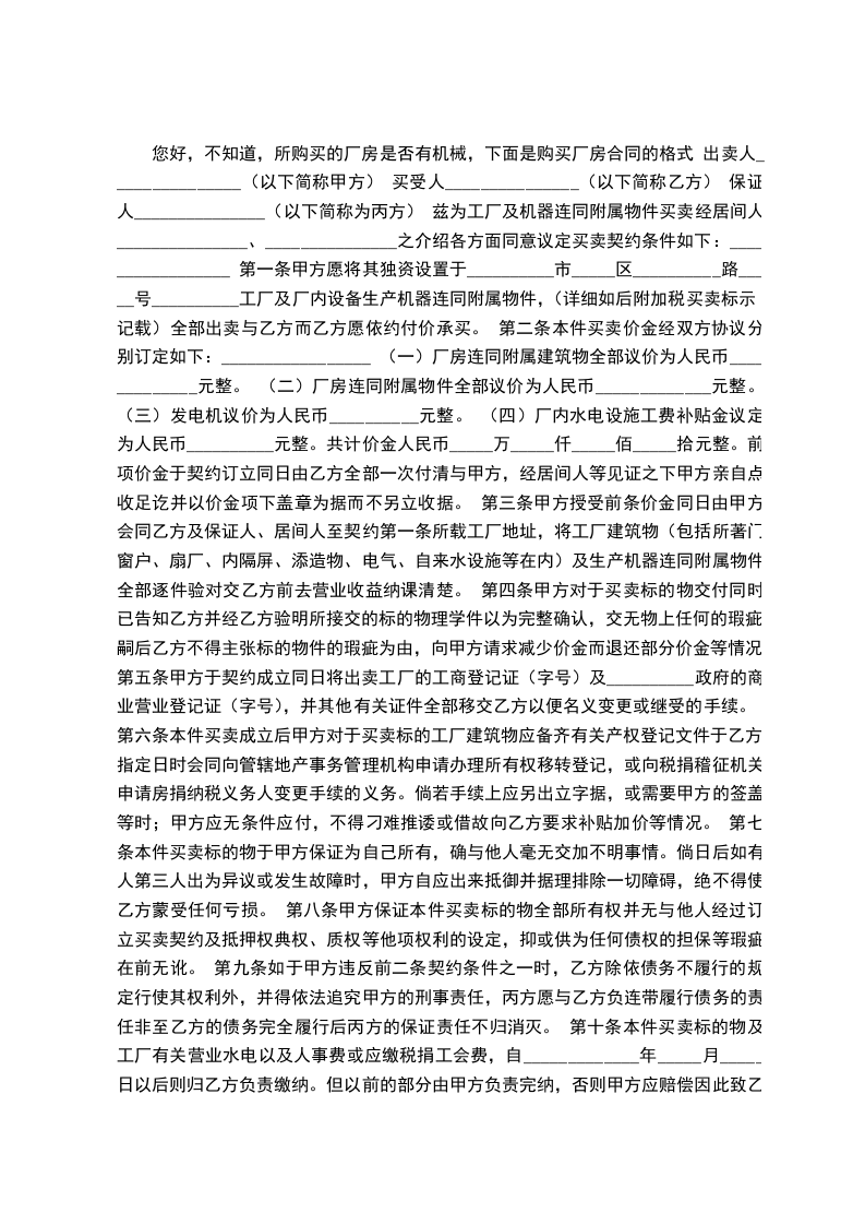 您好,不知道,所购买的厂房是否有机械,下面是购买厂房合同的格式 出卖人_______________(以下简称甲方) 买受人_______________(以下简称乙方) 保证人_______________(以下简称为丙方) 兹为工厂及机器连同附属物件买卖经居间人_______________、_______________之介绍各方面同意议定买卖契约条件如下:_________________ 第一条甲方愿将其独资设置于__________市_____区__________路_____号__________工厂及厂内设备生产机器连同附属物件,(详细如后附加税买卖标示记载)全部出卖与乙方而乙方愿依约付价承买。 第二条本件买卖价金经双方协议分别订定如下:_________________ (一)厂房连同附属建筑物全部议价为人民币_____________元整。 (二)厂房连同附属物件全部议价为人民币_____________元整。 (三)发电机议价为人民币__________元整。 (四)厂内水电设施工费补贴金议定为人民币__________元整。共计价金人民币_____万_____仟_____佰_____拾元整。前项价金于契约订立同日由乙方全部一次付清与甲方,经居间人等见证之下甲方亲自点收足讫并以价金项下盖章为据而不另立收据。 第三条甲方授受前条价金同日由甲方会同乙方及保证人、居间人至契约第一条所载工厂地址,将工厂建筑物(包括所著门窗户、扇厂、内隔屏、添造物、电气、自来水设施等在内)及生产机器连同附属物件全部逐件验对交乙方前去营业收益纳课清楚。 第四条甲方对于买卖标的物交付同时已告知乙方并经乙方验明所接交的标的物理学件以为完整确认,交无物上任何的瑕疵。 嗣后乙方不得主张标的物件的瑕疵为由,向甲方请求减少价金而退还部分价金等情况。 第五条甲方于契约成立同日将出卖工厂的工商登记证(字号)及__________政府的商业营业登记证(字号),并其他有关证件全部移交乙方以便名义变更或继受的手续。 第六条本件买卖成立后甲方对于买卖标的工厂建筑物应备齐有关产权登记文件于乙方,指定日时会同向管辖地产事务管理机构申请办理所有权移转登记,或向税捐稽征机关申请房捐纳税义务人变更手续的义务。倘若手续上应另出立字据,或需要甲方的签盖等时;甲方应无条件应付,不得刁难推诿或借故向乙方要求补贴加价等情况。 第七条本件买卖标的物于甲方保证为自己所有,确与他人毫无交加不明事情。倘日后如有人第三人出为异议或发生故障时,甲方自应出来抵御并据理排除一切障碍,绝不得使乙方蒙受任何亏损。 第八条甲方保证本件买卖标的物全部所有权并无与他人经过订立买卖契约及抵押权典权、质权等他项权利的设定,抑或供为任何债权的担保等瑕疵在前无讹。 第九条如于甲方违反前二条契约条件之一时,乙方除依债务不履行的规定行使其权利外,并得依法追究甲方的刑事责任,丙方愿与乙方负连带履行债务的责任非至乙方的债务完全履行后丙方的保证责任不归消灭。 第十条本件买卖标的物及工厂有关营业水电以及人事费或应缴税捐工会费,自_____________年_____月_____日以后则归乙方负责缴纳。但以前的部分由甲方负责完纳,否则甲方应赔偿因此致乙方受损害的责任。 第十一条甲方自本买卖契约订立日起,不得借用__________厂号或以该厂关系任何名份对外交涉事宜。若甲方违背前项约定乙方受有损害时,乙方得请求损害赔偿甲方不得异议。 第十二条甲方出卖工厂以前厂方有对内外未清的债权债务,乙方不为承担或受让,该项债权债务仍由甲方取得或偿还。但乙方不得代甲方收取该项债权,否则甲方得追究责任。 第十三条本件买卖费用议定负担如下:_________________ (一)本买卖契约印花及公证费增值税均由甲方负担。 (二)本买卖工厂建筑物产权移转登记及工厂名义变更登记诸费用则归乙方负担。 第十四条本件买卖嗣后不论任何理由于一方不得解除契约或主张买回等情况。 第十五条本件买卖标的物如下:______________ 本契约一式两份,甲、乙双方各执一份为凭。 卖方(甲方):______________印 身份证统一号码:_________________ 地址:_________________ 买方(乙方):______________印 身份证统一号码:_________________ 地址:_________________ 保证人(丙方):______________印 身份证统一号码:_________________ _____________年_____月_____日