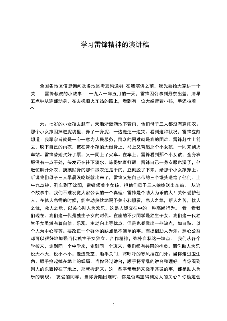 我演讲的题目是《让雷锋精神发扬光大》。雷锋叔叔是一个永恒的精神楷模,他的光辉事迹永远闪耀着金色的光芒,如暗夜里的灯塔,似晨曦中的朝阳,给我们的人生指明正确的方向。