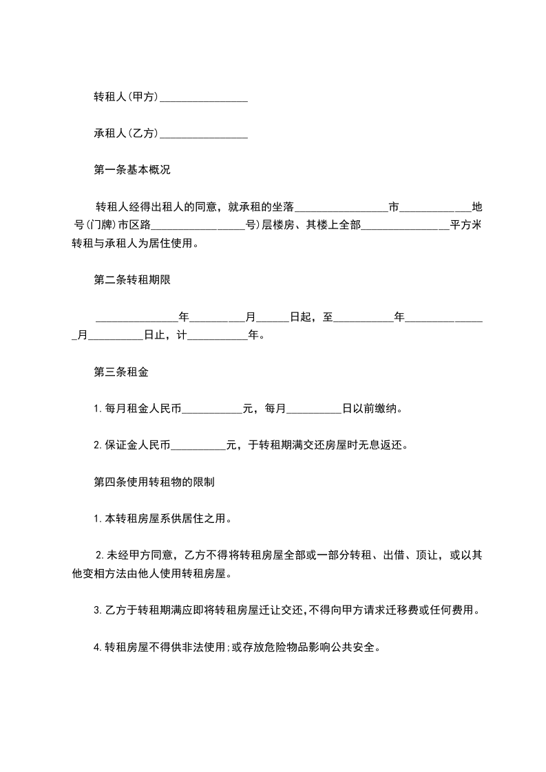 转租人经得出租人的同意,就承租的坐落_________________市_____________地号(门牌)市区路_________________号)层楼房、其楼上全部________________平方米转租与承租人为居住使用。