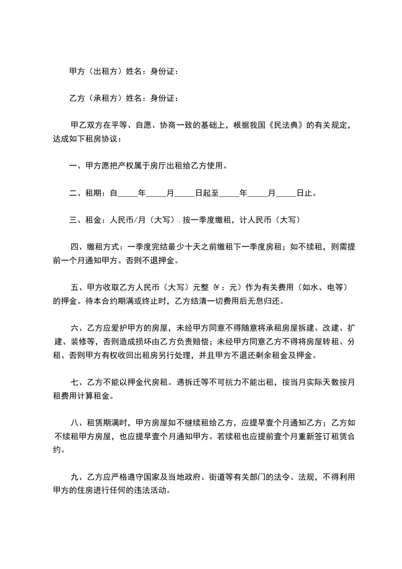 甲乙双方在平等、自愿、协商一致的基础上,根据我国《民法典》的有关规定,达成如下租房协议: