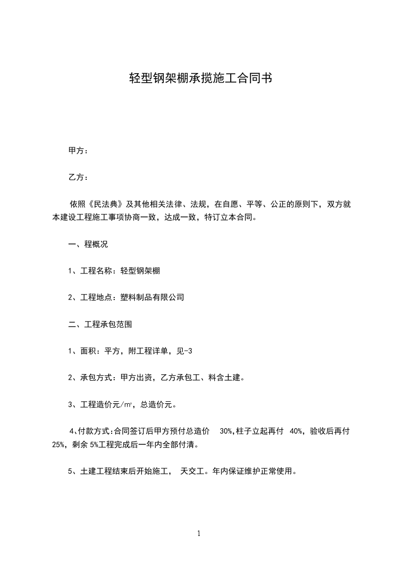 2、承包方式:甲方出资,乙方承包工、料(本钢架棚所有材料允许误差±.3mm)含土建。