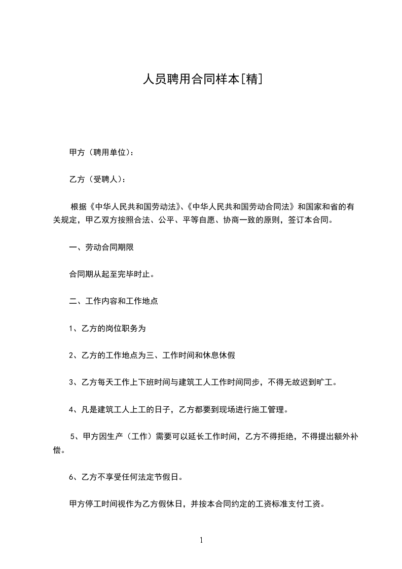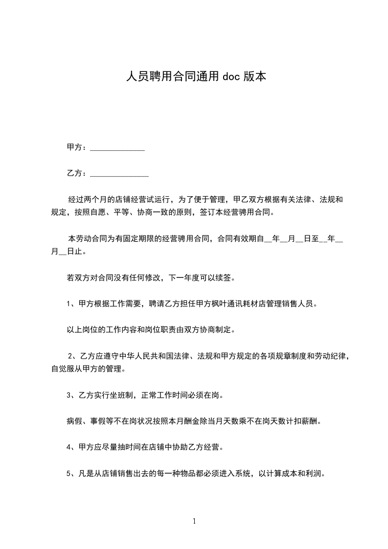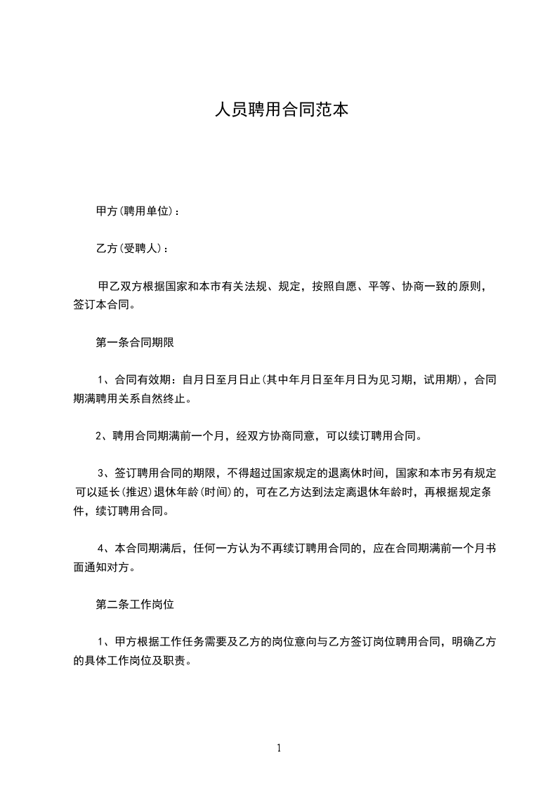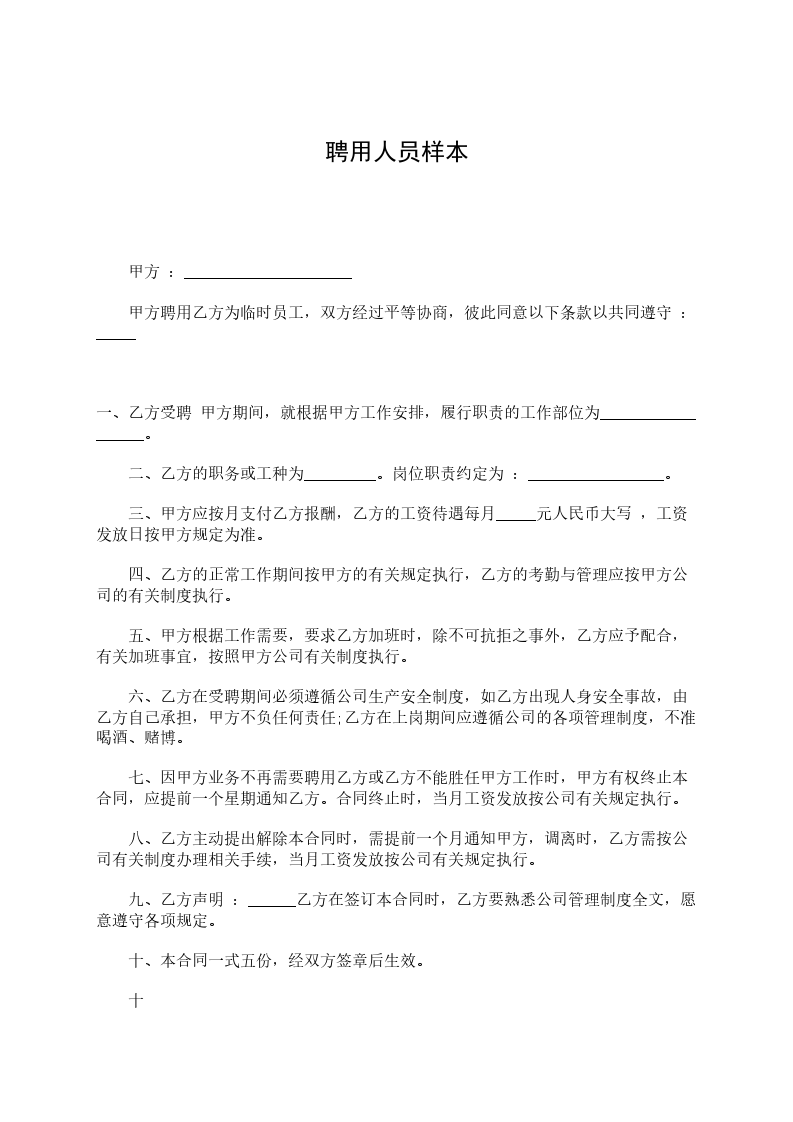 甲方聘用乙方为临时员工,双方经过平等协商,彼此同意以下条款以共同遵守: