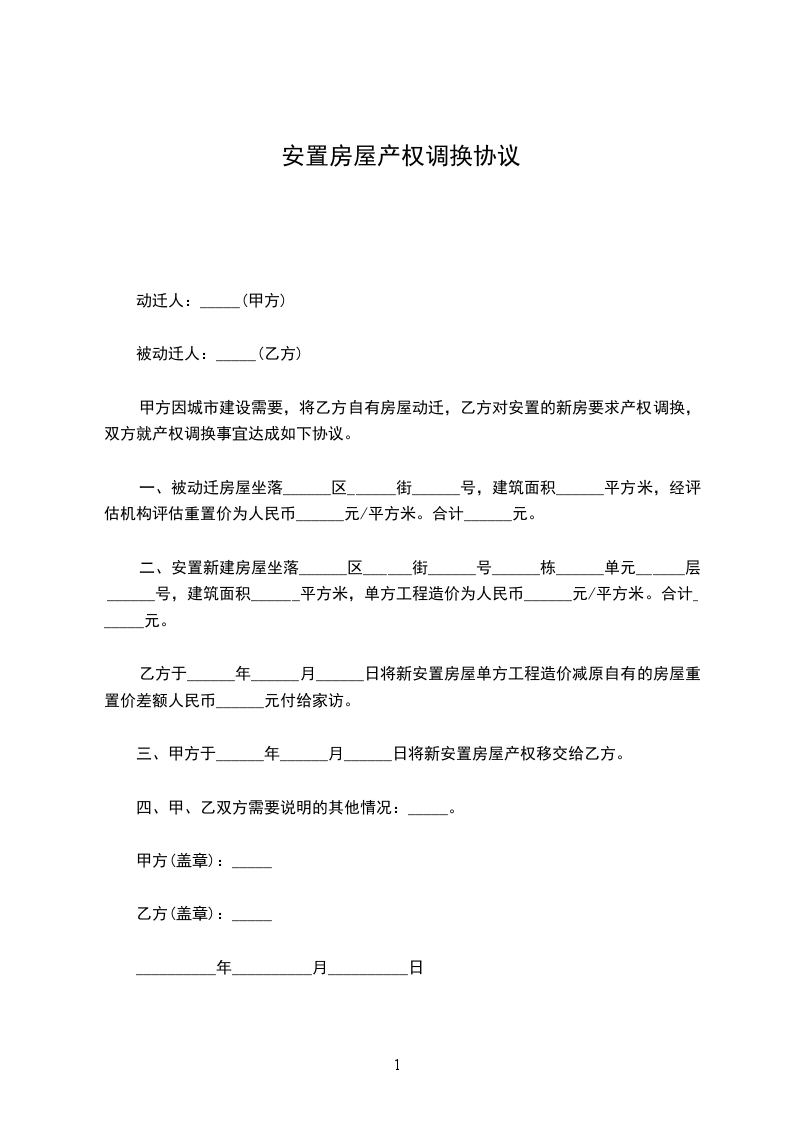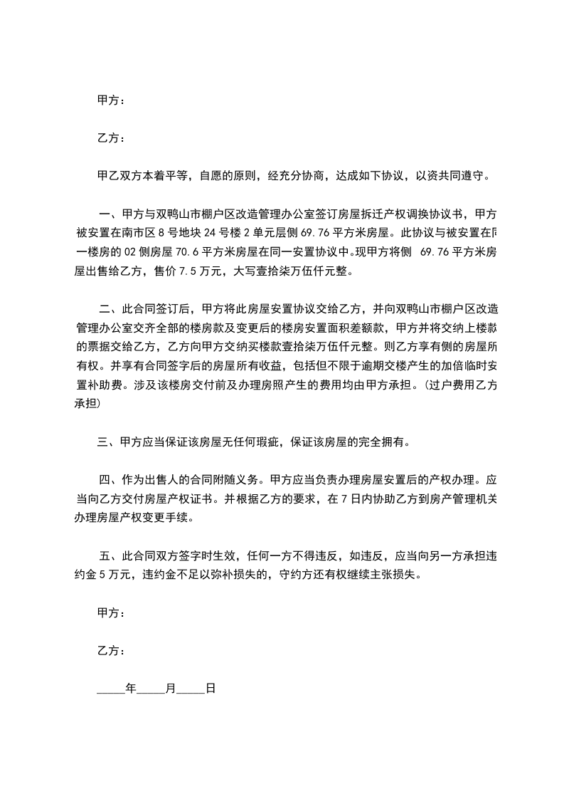 三、甲方于月日将新安置房屋产权移交给乙方。