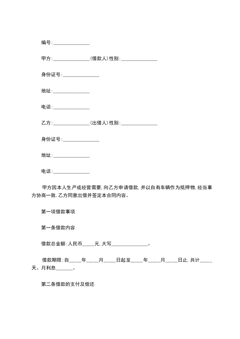甲方因本人生产或经营需要,向乙方申请借款,并以自有车辆作为抵押物,经当事方协商一致,乙方同意出借并签定本合同内容。
