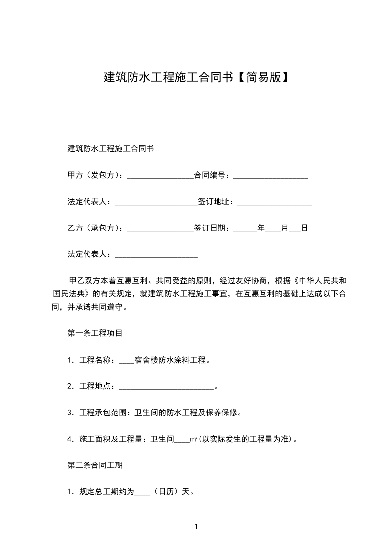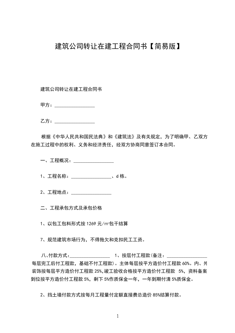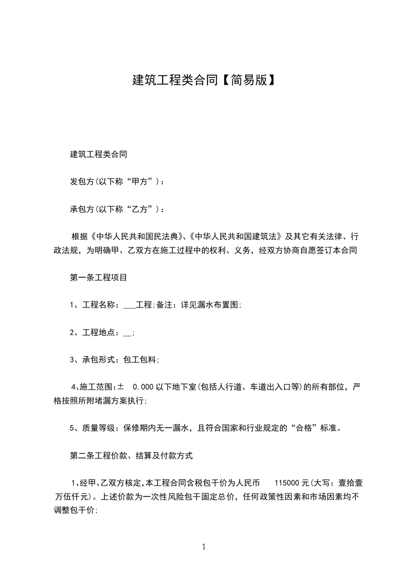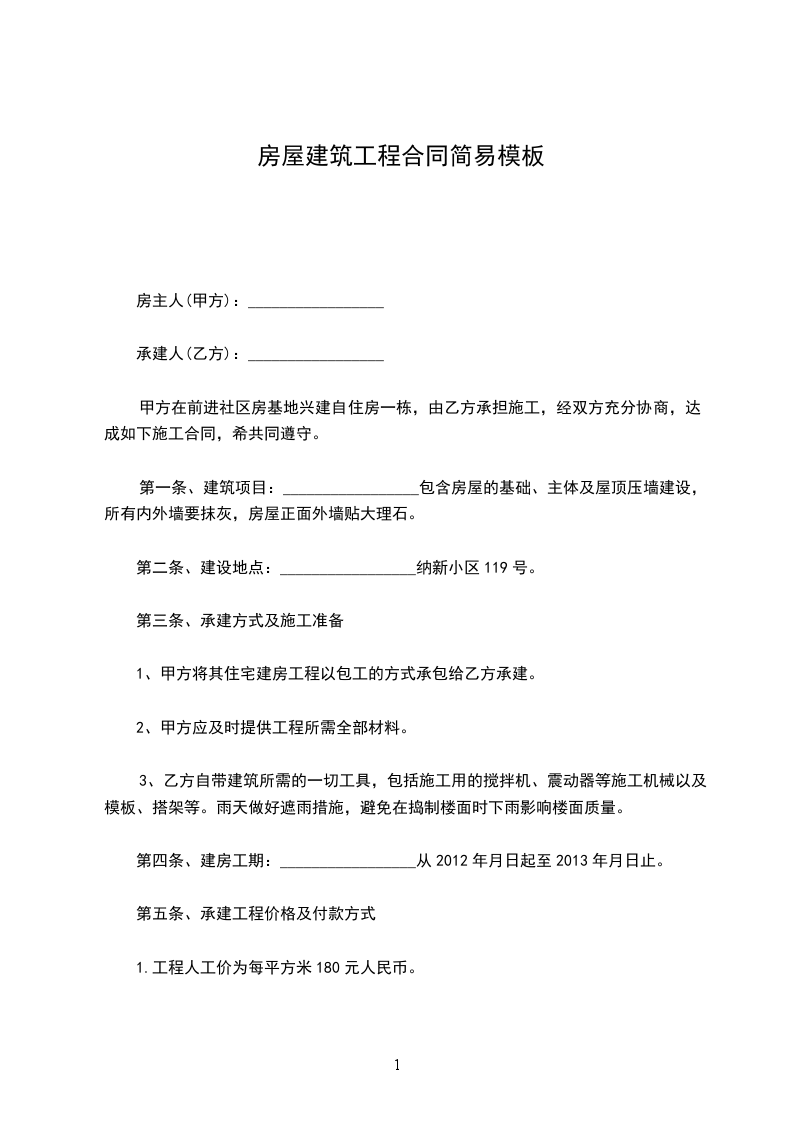 第一条、建筑项目:_________________包含房屋的基础、主体及屋顶压墙建设,所有内外墙要抹灰,房屋正面外墙贴大理石。