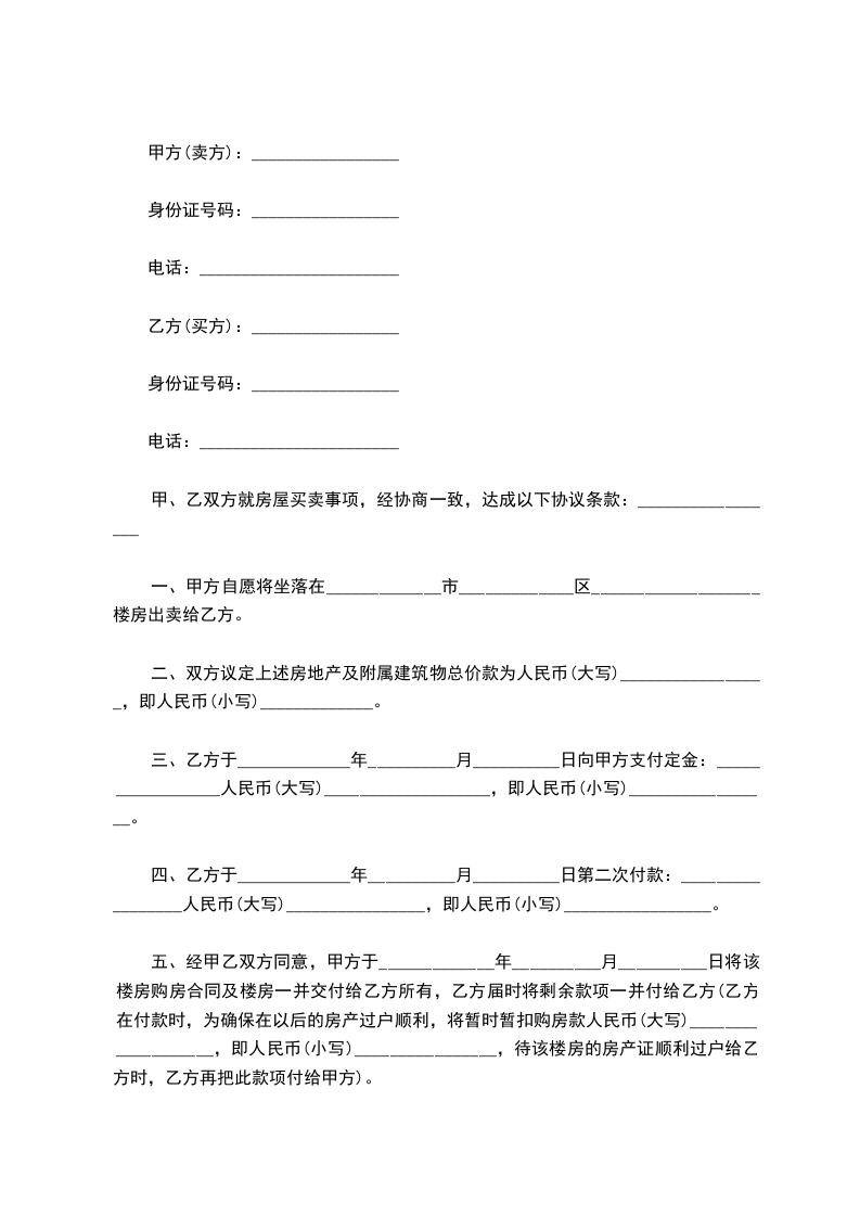 一、甲方自愿将坐落在_____________市_____________区___________________楼房出卖给乙方。