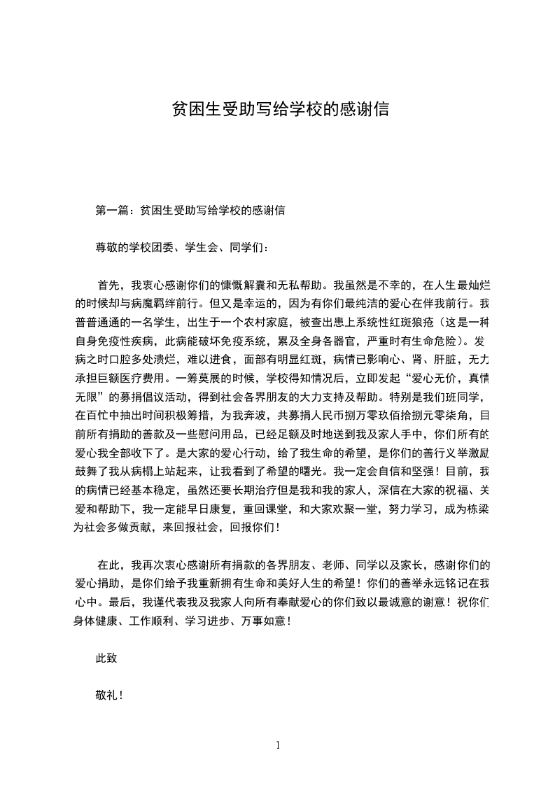 第一篇:贫困生受助写给学校的感谢信