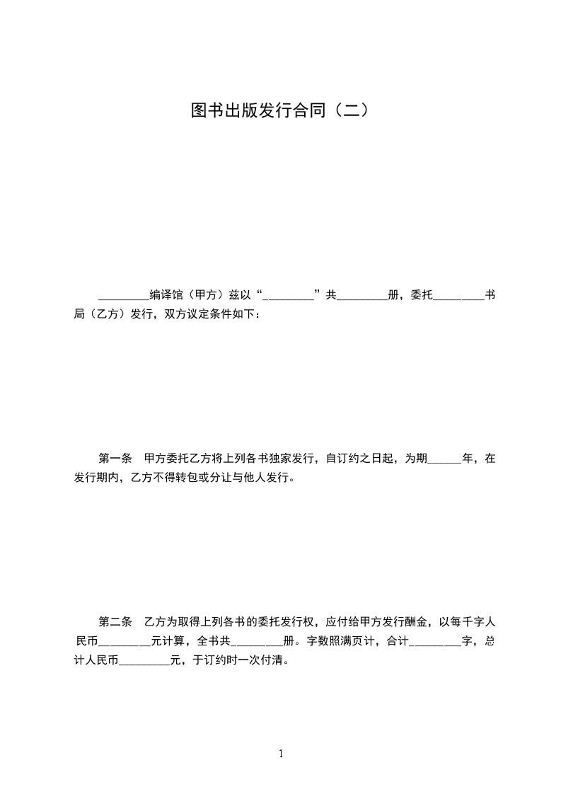 第二条 乙方为取得上列各书的委托发行权,应付给甲方发行酬金,以每千字人民币_________元计算,全书共_________册。字数照满页计,合计_________字,总计人民币_________元,于订约时一次付清。