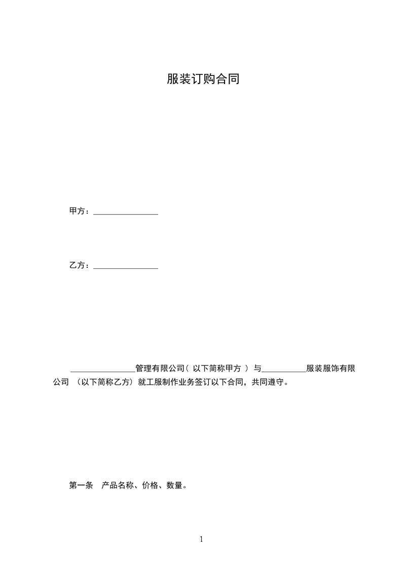 ________________管理有限公司( 以下简称甲方 ) 与___________服装服饰有限公司 (以下简称乙方) 就工服制作业务签订以下合同,共同遵守。