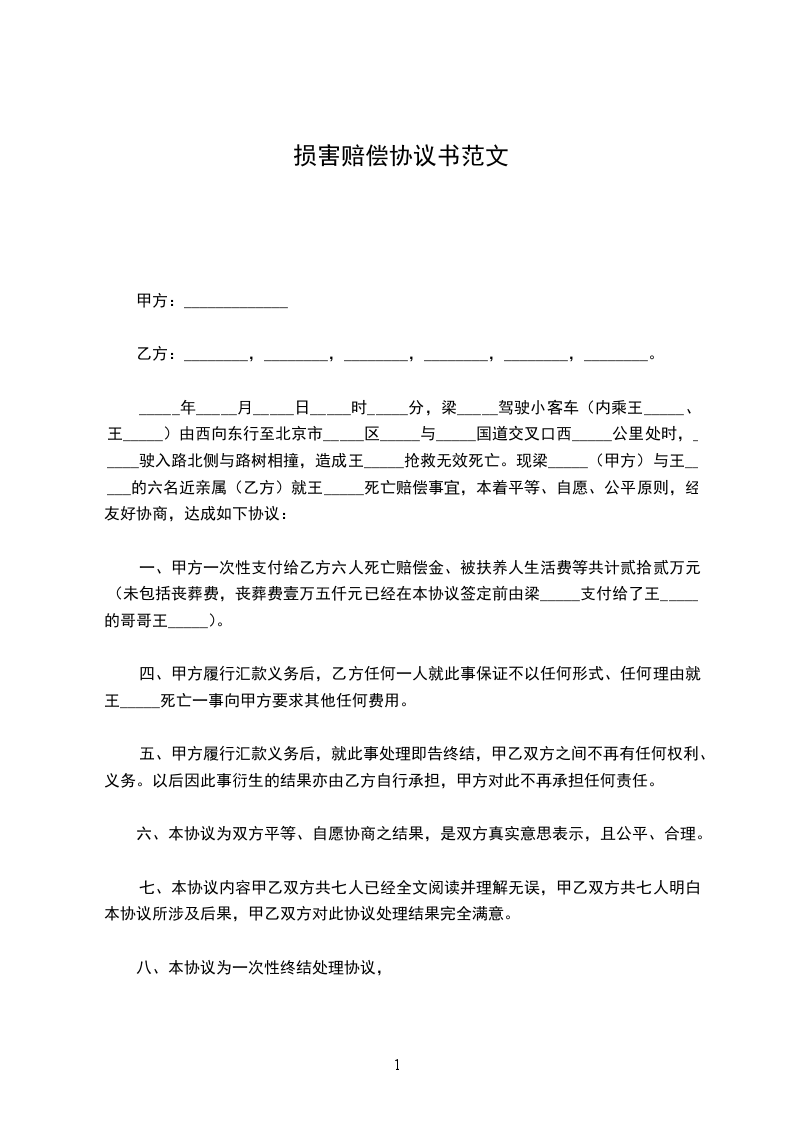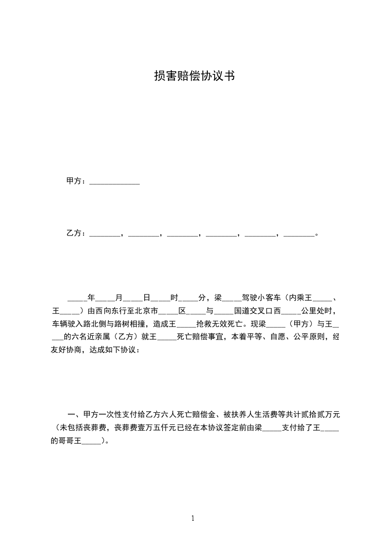 _____年_____月_____日_____时_____分,梁_____驾驶小客车(内乘王_____、王_____)由西向东行至北京市_____区_____与_____国道交叉口西_____公里处时,车辆驶入路北侧与路树相撞,造成王_____抢救无效死亡。现梁_____(甲方)与王_____的六名近亲属(乙方)就王_____死亡赔偿事宜,本着平等、自愿、公平原则,经友好协商,达成如下协议: