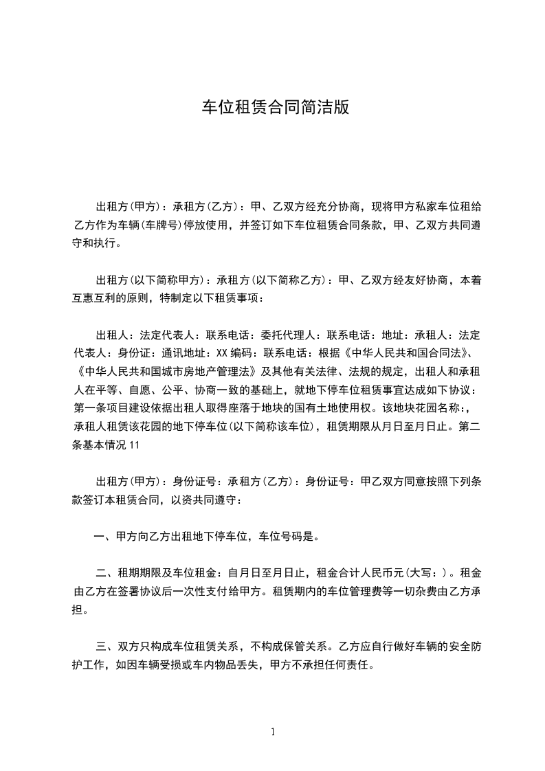 出租人:法定代表人:联系电话:委托代理人:联系电话:地址:承租人:法定代表人:身份证:通讯地址:XX编码:联系电话:根据《中华人民共和国合同法》、《中华人民共和国城市房地产管理法》及其他有关法律、法规的规定,出租人和承租人在平等、自愿、公平、协商一致的基础上,就地下停车位租赁事宜达成如下协议:第一条项目建设依据出租人取得座落于地块的国有土地使用权。该地块花园名称:,承租人租赁该花园的地下停车位(以下简称该车位),租赁期限从月日至月日止。第二条基本情况11