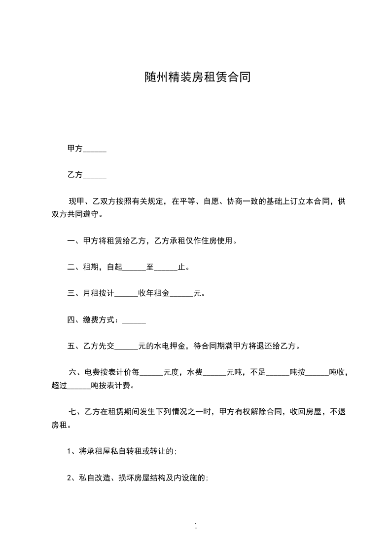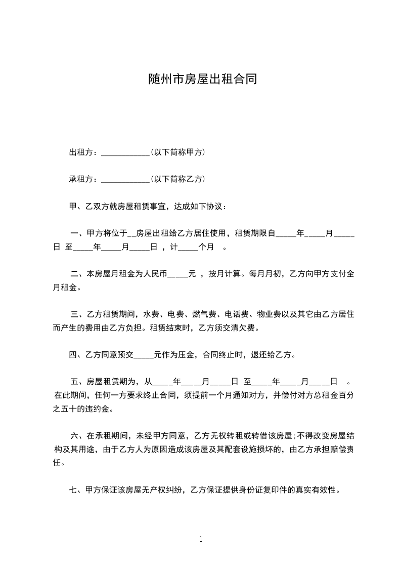 六、租赁期间,任何一方提出终止合同,需提前__________个月书面通知对方,经双方协商后签订终止合同书。若一方强行中止合同,须向另一方支付违约金_____元。
