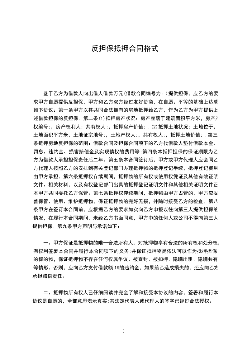 鉴于乙方为借款人向出借人借款万元(借款合同编号为:)提供担保,应乙方的要求甲方自愿提供反担保,甲方和乙方双方经过友好协商,在自愿、平等的基础上达成如下协议:第一条甲方以其共同合法拥有的房地抵押给乙方,作为乙方为甲方提供上述借款担保的反担保。第二条(1)抵押房产状况:房产座落于建筑面积平方米,房产产权编号:,房产权利人:共有权人:,抵押房产价值:.(2)抵押土地状况:土地位于,土地面积平方米,土地证宗地号:,土地产权人:,共有权人:,抵押土地价值:.第三条抵押房地反担保的范围:借款合同及担保合同项下的乙方代借款人垫付借款本金、罚息、违约金、损害赔偿金及实现债权的费用等;第四条本抵押担保的保证期限为乙方为借款人承担担保责任后二年。第五条本合同签订后,甲方或甲方代理人应会同乙方代理人按照乙方的安排到有关登记部门办理抵押物的抵押登记手续,抵押登记费用由甲方承担。第六条抵押权存续期间,抵押物的所有权或使用权凭证及其他有效证明文件、相关材料,以及有权登记部门出具的抵押登记证明文件和其他相关证明文件正本甲方共同委托乙方保管。第七条抵押权存续期间,抵押物由甲方占管的,甲方应妥善保管、使用、维护抵押物,保证抵押物的完好无损,并随时接受乙方的检查。第八条甲方在签订本合同前,应根据乙方的要求如实向乙方申报以往向第三人提供担保的情况,在履行本合同期间,未经乙方书面同意,甲方中的任何人或公司不得向第三人提供担保。第九条甲方声明与承诺如下: