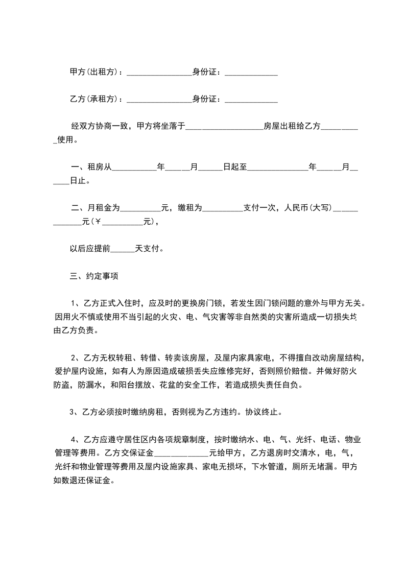 4、乙方应遵守居住区内各项规章制度,按时缴纳水、电、气、光纤、电话、物业管理等费用。乙方交保证金_____________元给甲方,乙方退房时交清水,电,气,光纤和物业管理等费用及屋内设施家具、家电无损坏,下水管道,厕所无堵漏。甲方如数退还保证金。