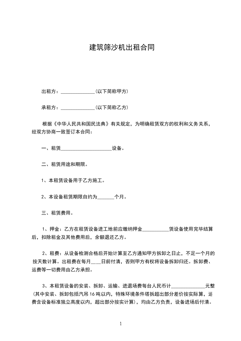 1、押金:乙方在租赁设备进工地前应缴纳押金___________赁设备使用完毕结算后,扣除租金及其他费用后,余额退还乙方。