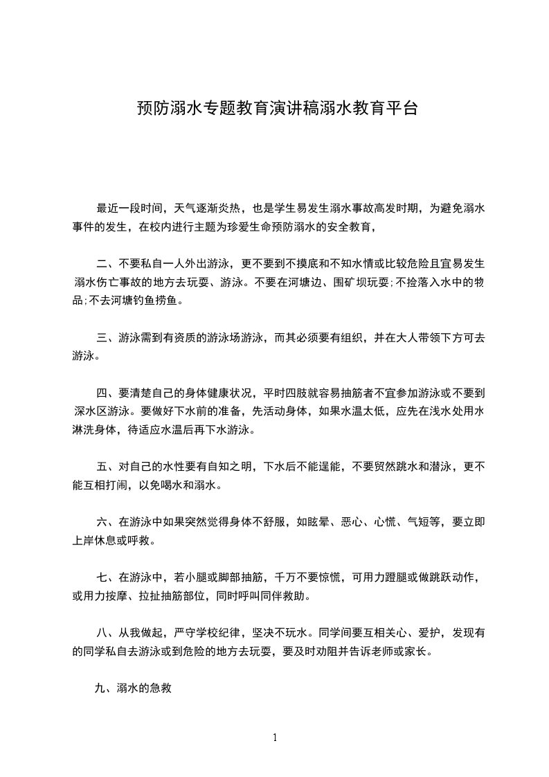 综上所述,溺水是非常危险的,在日常生活中要提高安全意识,安全第一,防患于未然。水无情,人有情。其实,只要我们在生活中注意各种游水、戏水事项,提高安全防范意识,学会在遭遇溺水懂得如何自救和他人遭遇溺水时如何抢救,溺水事件是可以防止的。相关文章:1.珍爱生命预防溺水演讲稿2.防溺水安全教育演讲稿范X五篇3.防溺水安全教育发言稿范X4.学校领导防溺水教育讲话稿5.青少年暑假防溺水教育演讲稿8篇中小学生升旗仪式防溺水安全...