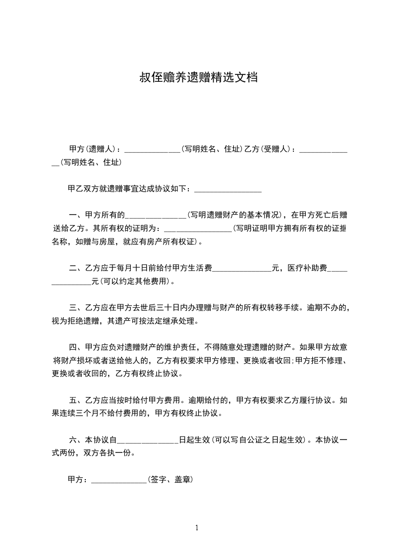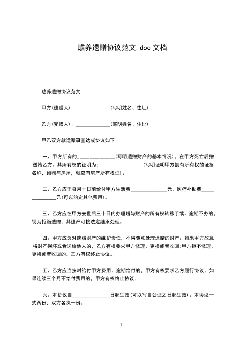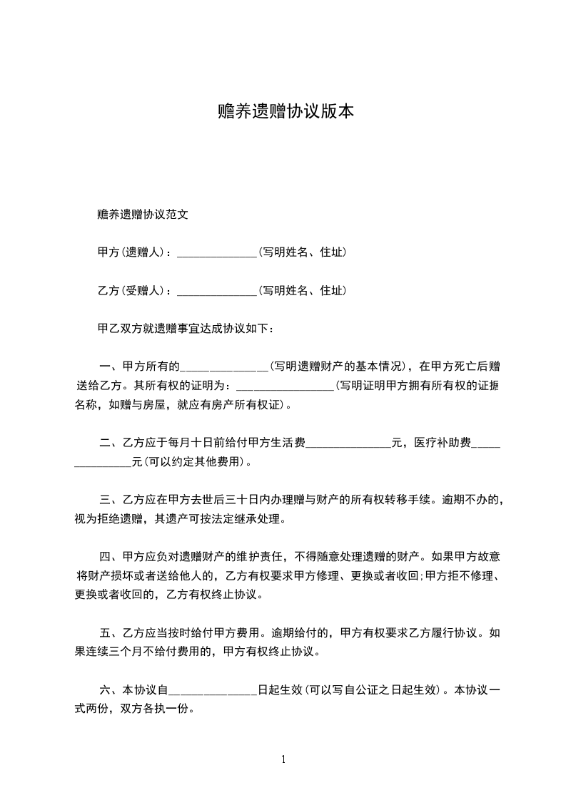 一、甲方所有的_______________(写明遗赠财产的基本情况),在甲方死亡后赠送给乙方。其所有权的证明为:_________________(写明证明甲方拥有所有权的证据名称,如赠与房屋,就应有房产所有权证)。