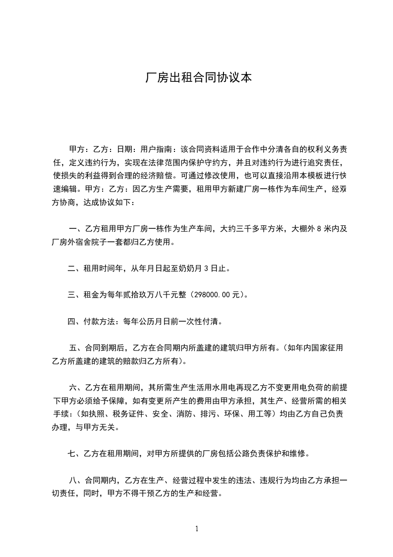 根据有关法律法规,甲乙双方经友好协商一致达成如下厂房租赁合同条款,以供遵守。