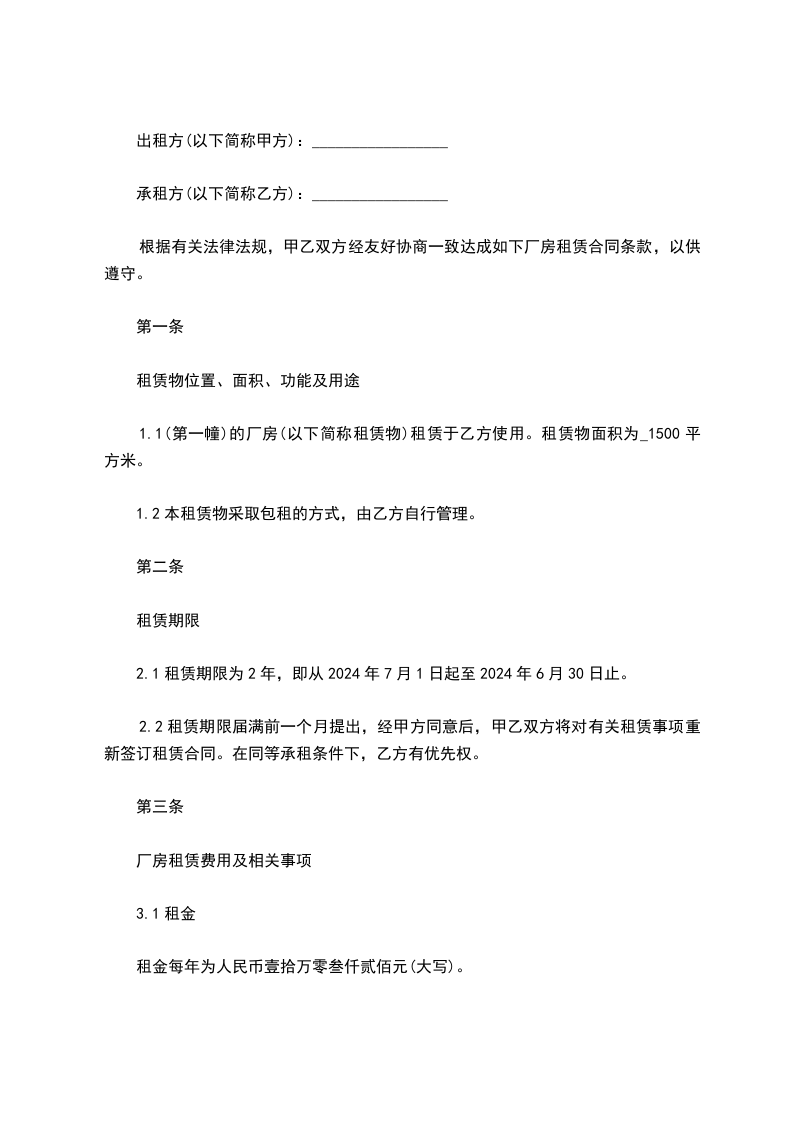 2.1租赁期限为2年,即从2024年7月1日起至2024年6月30日止。