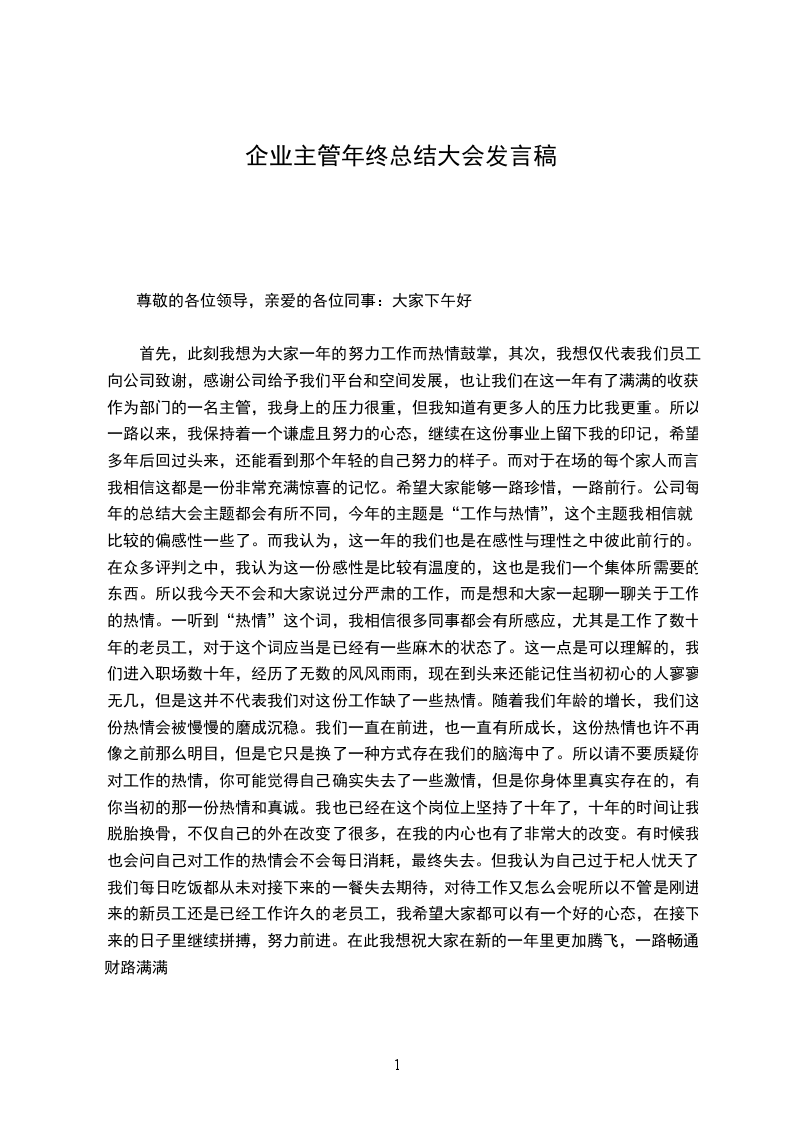首先,此刻我想为大家一年的努力工作而热情鼓掌,其次,我想仅代表我们员工向公司致谢,感谢公司给予我们平台和空间发展,也让我们在这一年有了满满的收获。作为部门的一名主管,我身上的压力很重,但我知道有更多人的压力比我更重。所以一路以来,我保持着一个谦虚且努力的心态,继续在这份事业上留下我的印记,希望多年后回过头来,还能看到那个年轻的自己努力的样子。而对于在场的每个家人而言,我相信这都是一份非常充满惊喜的记忆。希望大家能够一路珍惜,一路前行。公司每年的总结大会主题都会有所不同,今年的主题是“工作与热情”,这个主题我相信就比较的偏感性一些了。而我认为,这一年的我们也是在感性与理性之中彼此前行的。在众多评判之中,我认为这一份感性是比较有温度的,这也是我们一个集体所需要的东西。所以我今天不会和大家说过分严肃的工作,而是想和大家一起聊一聊关于工作的热情。一听到“热情”这个词,我相信很多同事都会有所感应,尤其是工作了数十年的老员工,对于这个词应当是已经有一些麻木的状态了。这一点是可以理解的,我们进入职场数十年,经历了无数的风风雨雨,现在到头来还能记住当初初心的人寥寥无几,但是这并不代表我们对这份工作缺了一些热情。随着我们年龄的增长,我们这份热情会被慢慢的磨成沉稳。我们一直在前进,也一直有所成长,这份热情也许不再像之前那么明目,但是它只是换了一种方式存在我们的脑海中了。所以请不要质疑你对工作的热情,你可能觉得自己确实失去了一些激情,但是你身体里真实存在的,有你当初的那一份热情和真诚。我也已经在这个岗位上坚持了十年了,十年的时间让我脱胎换骨,不仅自己的外在改变了很多,在我的内心也有了非常大的改变。有时候我也会问自己对工作的热情会不会每日消耗,最终失去。但我认为自己过于杞人忧天了。我们每日吃饭都从未对接下来的一餐失去期待,对待工作又怎么会呢所以不管是刚进来的新员工还是已经工作许久的老员工,我希望大家都可以有一个好的心态,在接下来的日子里继续拼搏,努力前进。在此我想祝大家在新的一年里更加腾飞,一路畅通,财路满满