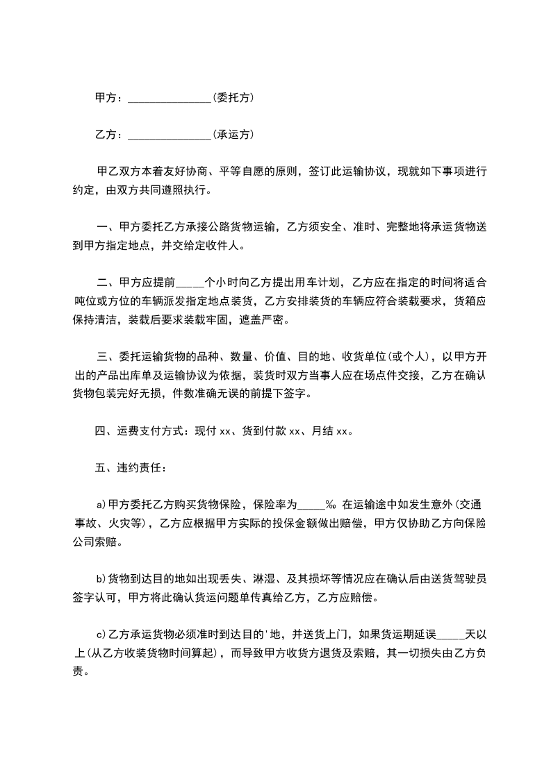 一、甲方委托乙方承接公路货物运输,乙方须安全、准时、完整地将承运货物送到甲方指定地点,并交给定收件人。
