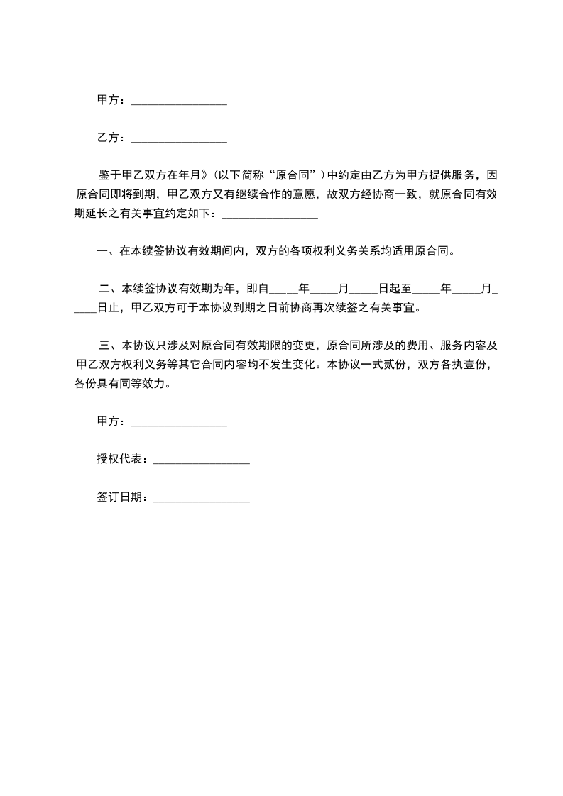 二、本续签协议有效期为年,即自_____年_____月_____日起至_____年_____月_____日止,甲乙双方可于本协议到期之日前协商再次续签之有关事宜。