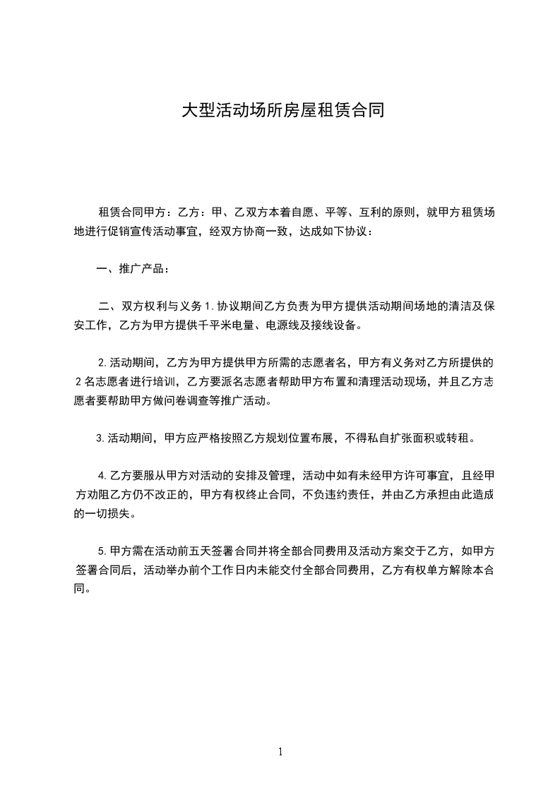 租赁合同甲方:乙方:甲、乙双方本着自愿、平等、互利的原则,就甲方租赁场地进行促销宣传活动事宜,经双方协商一致,达成如下协议: