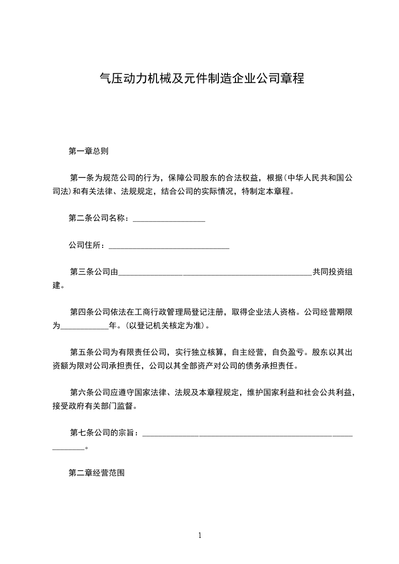 气压动力机械及元件制造企业公司章程