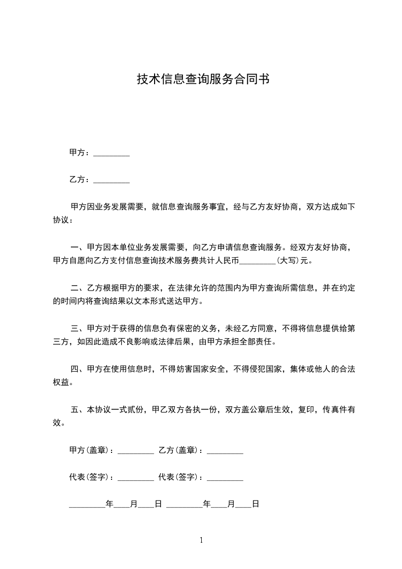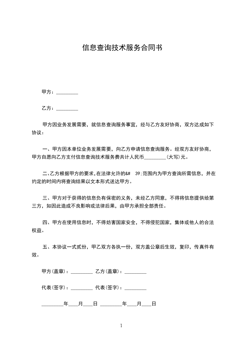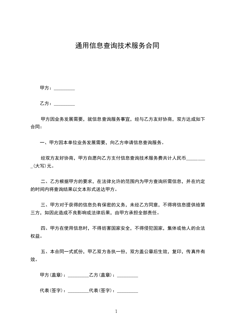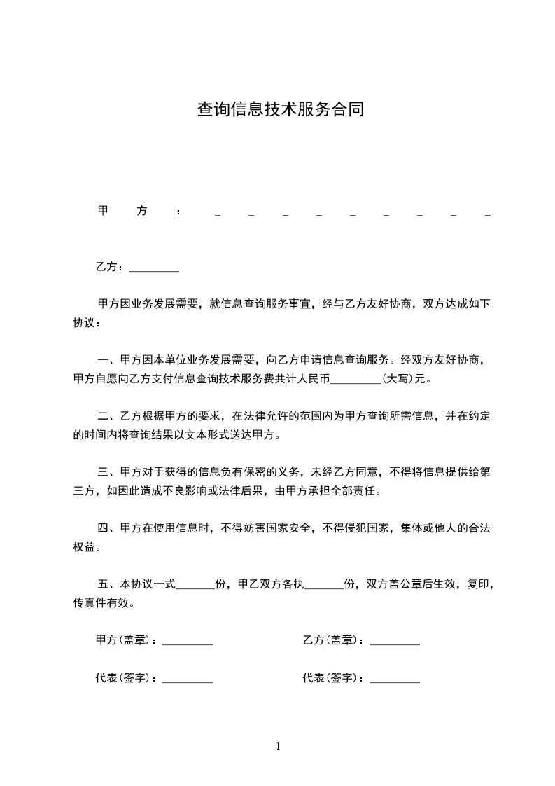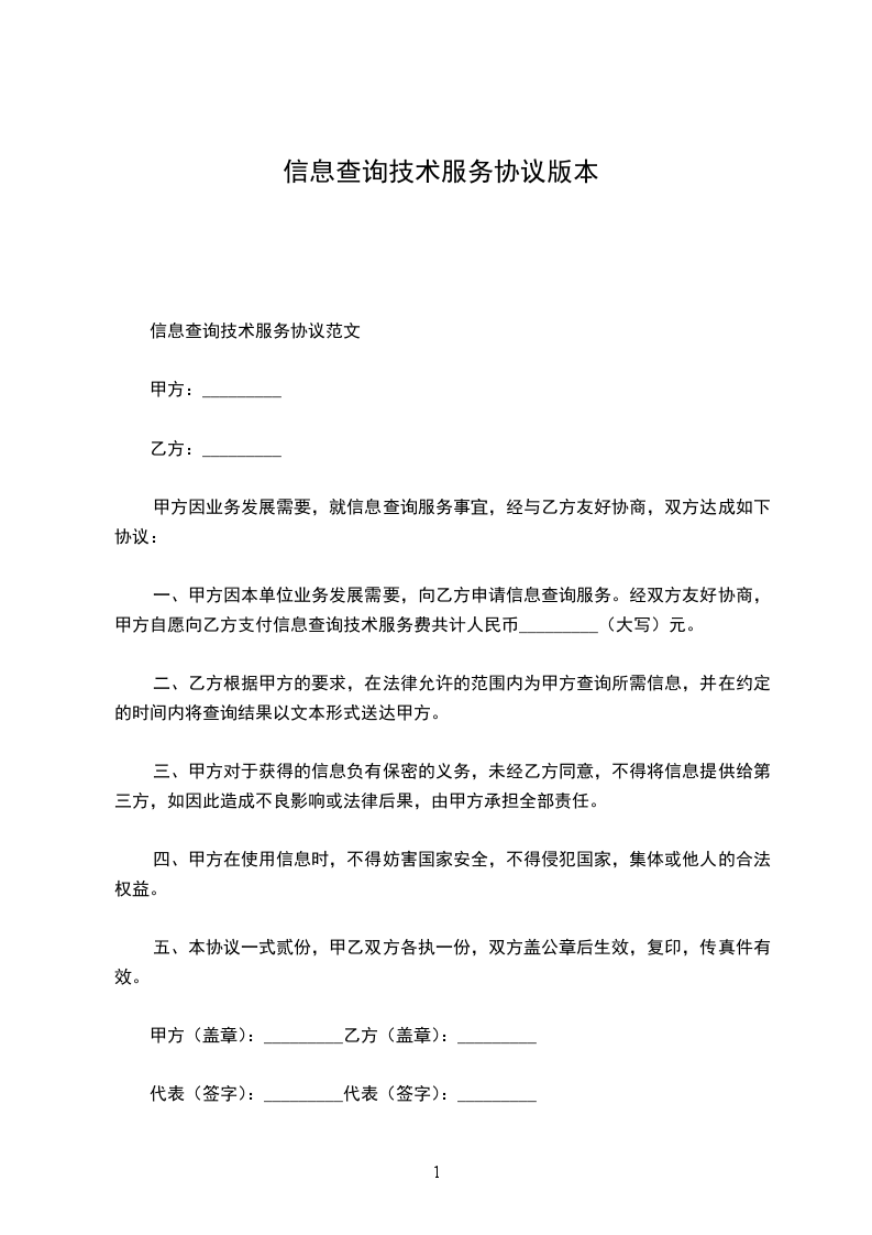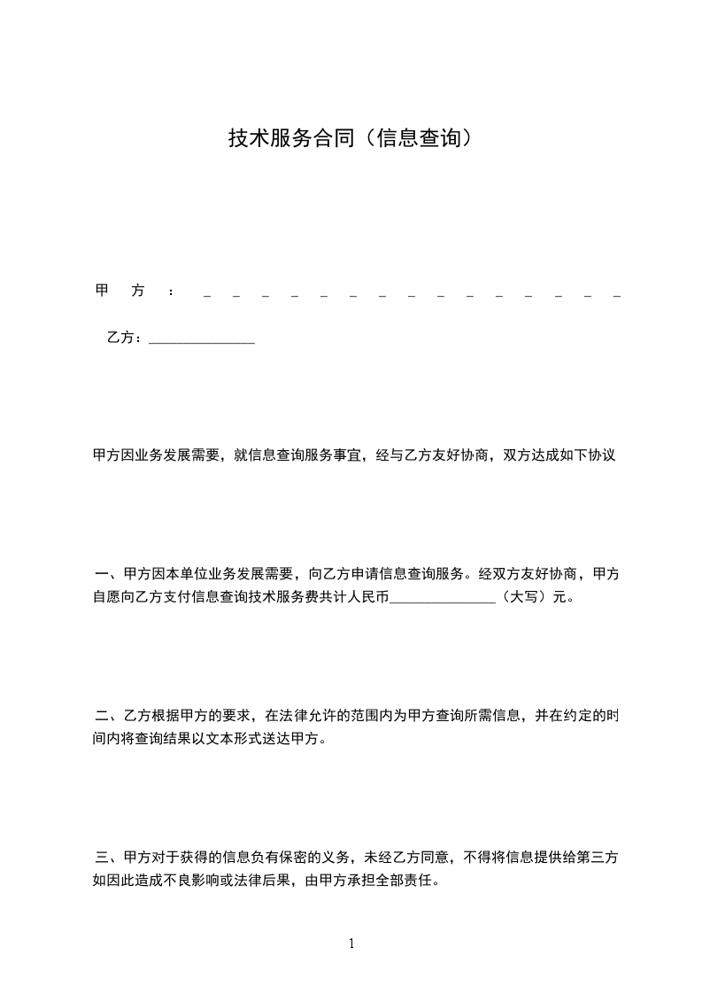 一、甲方因本单位业务发展需要,向乙方申请信息查询服务。经双方友好协商,甲方自愿向乙方支付信息查询技术服务费共计人民币_______________(大写)元。