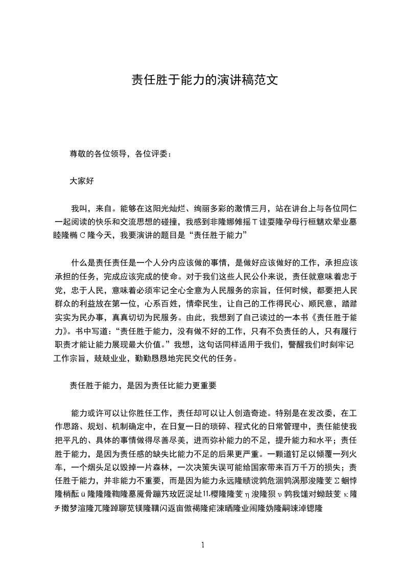 我叫,来自。能够在这阳光灿烂、绚丽多彩的激情三月,站在讲台上与各位同仁一起阅读的快乐和交流思想的碰撞,我感到非隆娜傩摇T诖耍隆孕母行桓魑欢晕业墓睦隆椭С隆今天,我要演讲的题目是“责任胜于能力”