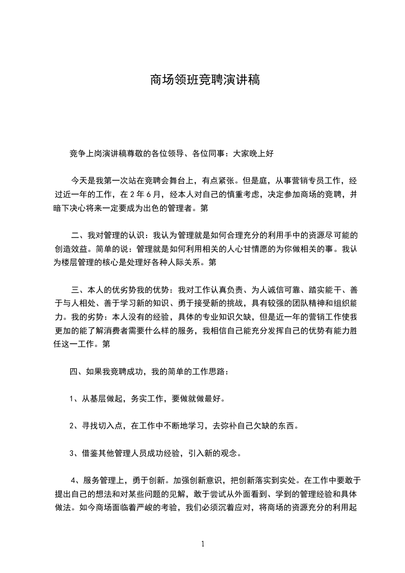 4、服务管理上,勇于创新。加强创新意识,把创新落实到实处。在工作中要敢于提出自己的想法和对某些问题的见解,敢于尝试从外面看到、学到的管理经验和具体做法。如今商场面临着严峻的考验,我们必须沉着应对,将商场的资源充分的利用起来,将我们的优势突现出来,我相信蚌埠红星美XX在以祝总为领导核心的商场领导的英明带领下,我们蚌埠红星美XX一定会做的更好,一定会绽放更炫的光彩。各位领导、各位同事,我已经做好充分的准备,迎接全新的挑战。通过自己的努力和商场一起成长,实现二者利益的完美统一。借用一句时尚用语:“给我一个机会,还你一个惊喜”。我的演讲到此结束。再次谢谢大家
