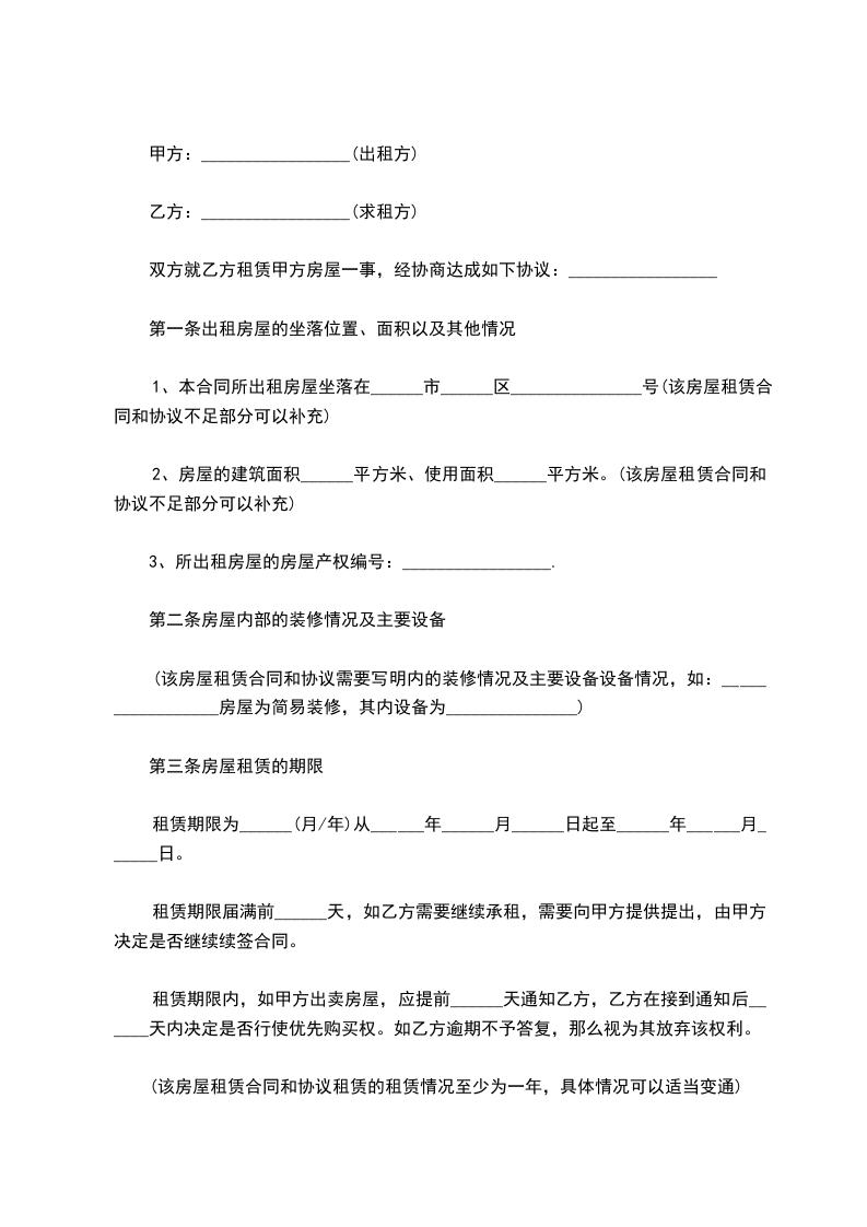 2、房屋的建筑面积______平方米、使用面积______平方米。(该房屋租赁合同和协议不足部分可以补充)