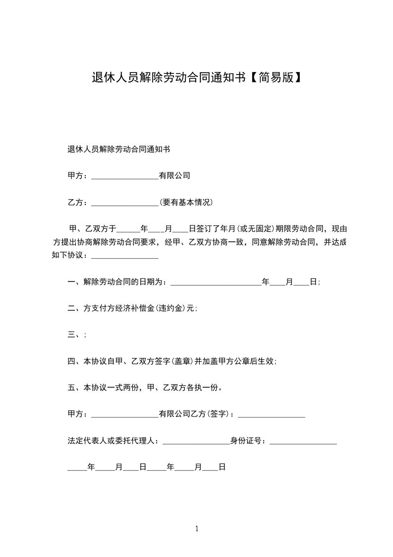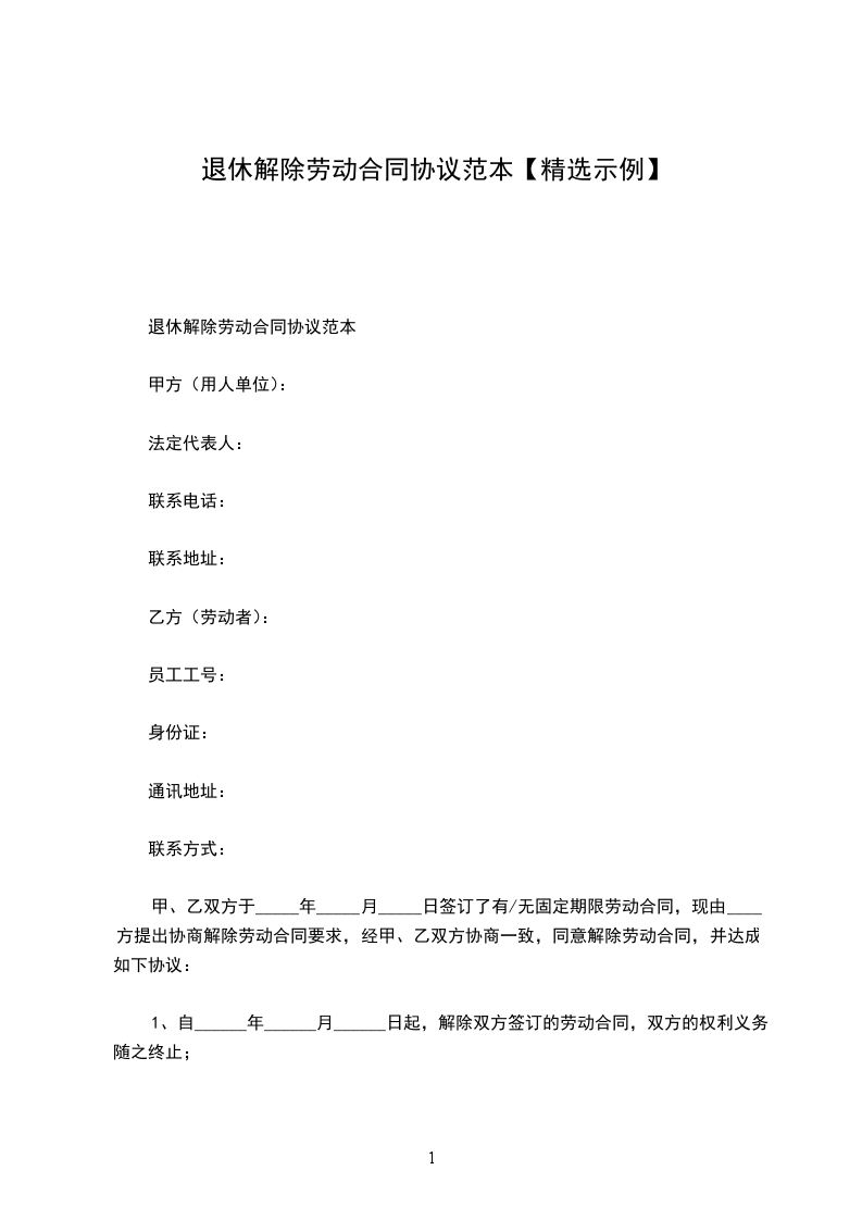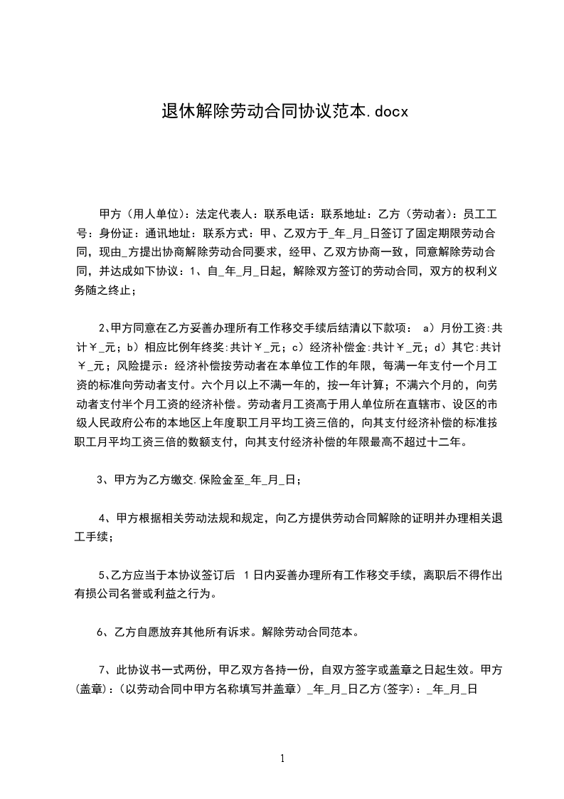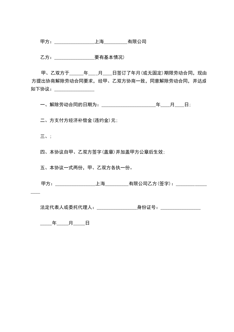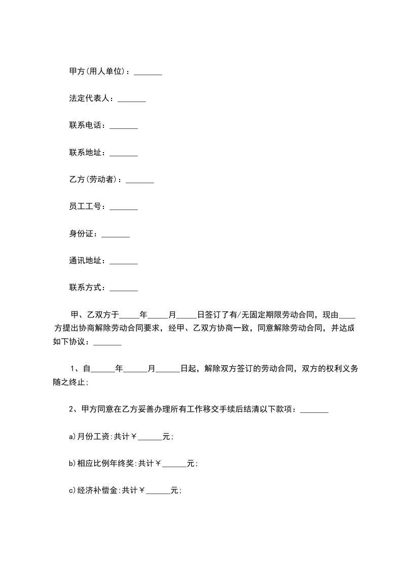 甲、乙双方于______年____月____日签订了年月(或无固定)期限劳动合同,现由方提出协商解除劳动合同要求,经甲、乙双方协商一致,同意解除劳动合同,并达成如下协议:_________________