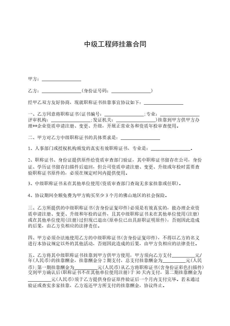 五、乙方将其中级职称证书挂靠到甲方供甲方使用,甲方须向乙方支付__________元/年(人民币)的挂靠酬金,挂靠酬金分2期支付,总支付挂靠酬金为__________元(人民币);第一期挂靠酬金为__________元(人民币)从乙方将职称证书(含身份证彩色扫描件)交到甲方确认后(职称证书不在其他单位使用注册)于30天内支付,第二期挂靠酬金为__________元(人民币)须于乙方提供身份证原件验证后一个月内支付完毕。若未通过验证或查实多家挂靠,乙方返还甲方所支付的挂靠酬金,协议终止。