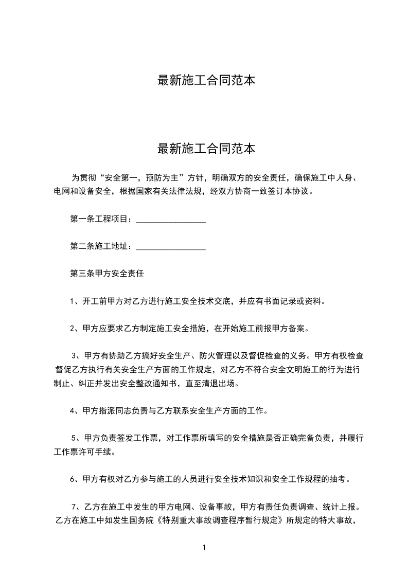 为贯彻“安全第一,预防为主”方针,明确双方的安全责任,确保施工中人身、电网和设备安全,根据国家有关法律法规,经双方协商一致签订本协议。