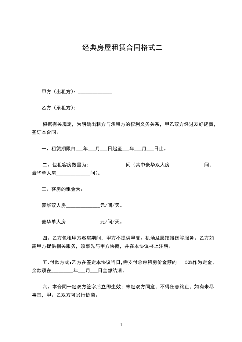 1、甲乙双方协商,乙方代理甲方房屋,每月租金为(人民币)_________,一年共计(人民币)_________.