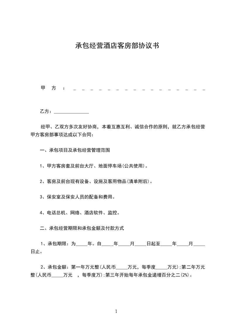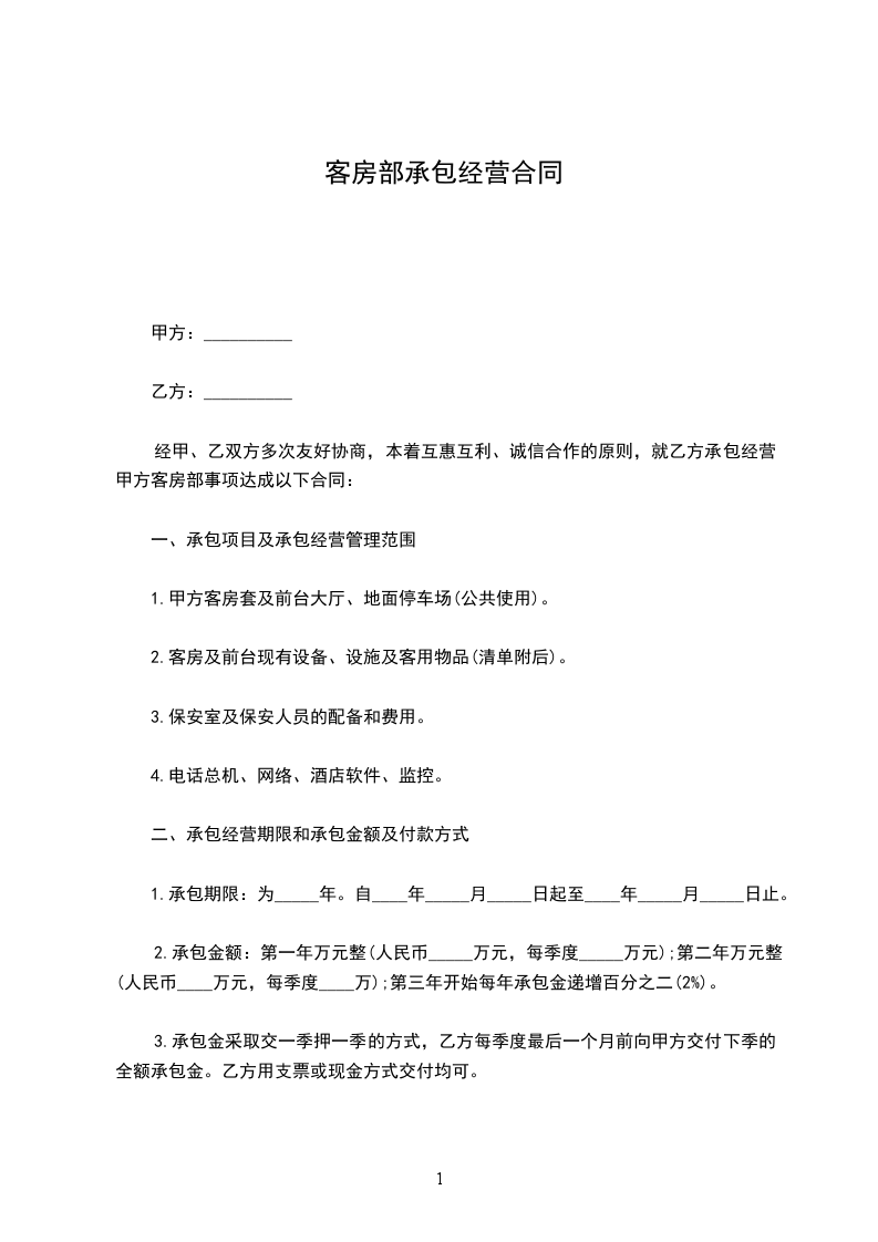 经甲、乙双方多次友好协商,本着互惠互利、诚信合作的原则,就乙方承包经营甲方客房部事项达成以下合同: