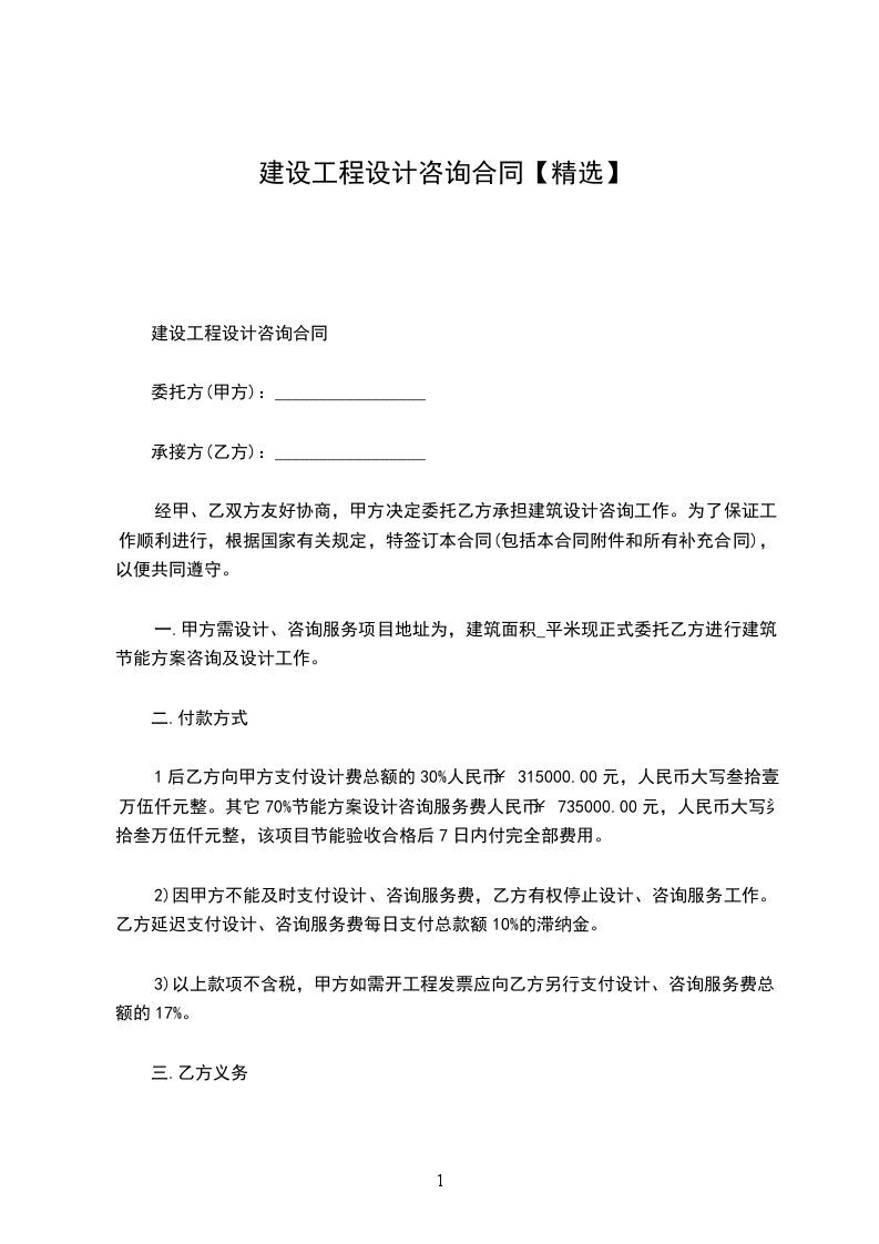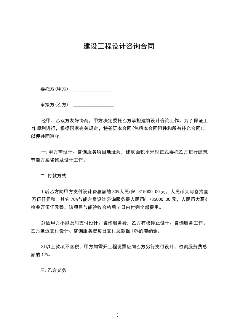 1后乙方向甲方支付设计费总额的30%人民币¥315000.00元,人民币大写叁拾壹万伍仟元整。其它70%节能方案设计咨询服务费人民币¥735000.00元,人民币大写柒拾叁万伍仟元整,该项目节能验收合格后7日内付完全部费用。