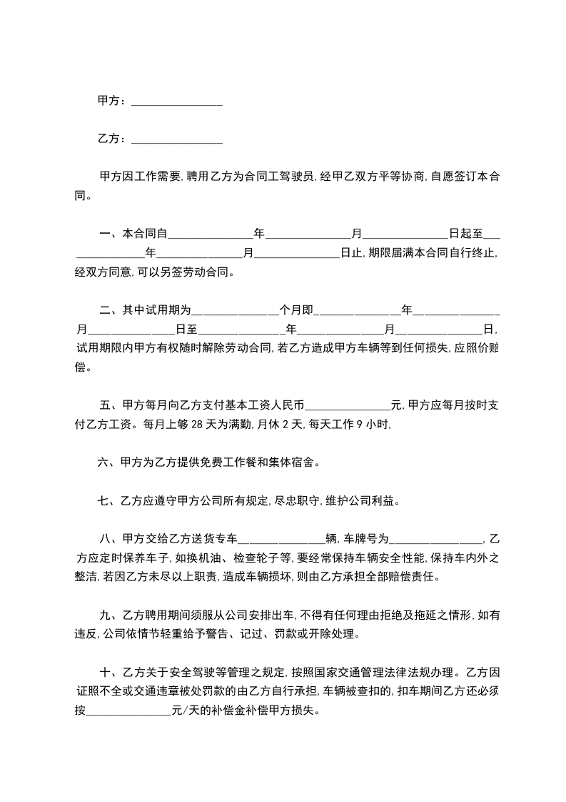 甲方因工作需要,聘用乙方为合同工驾驶员,经甲乙双方平等协商,自愿签订本合同。