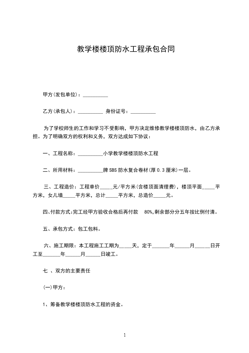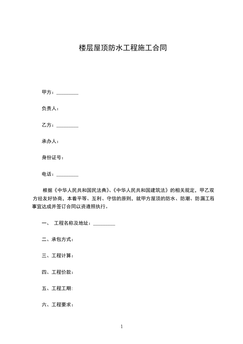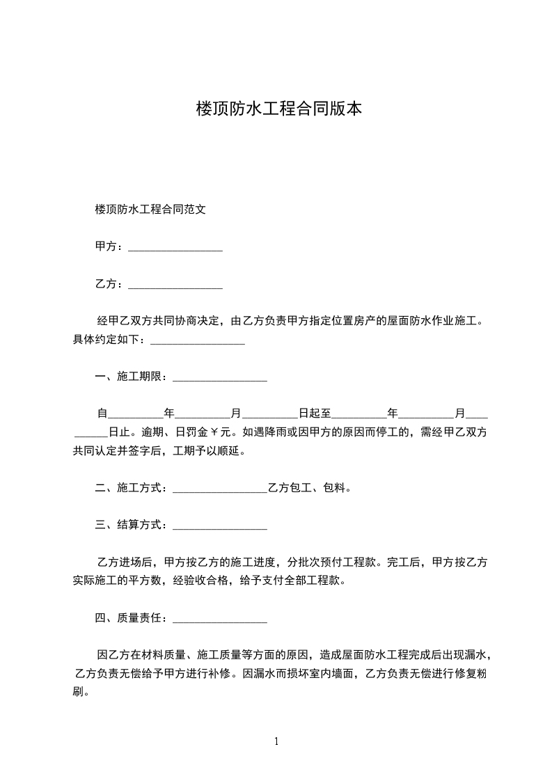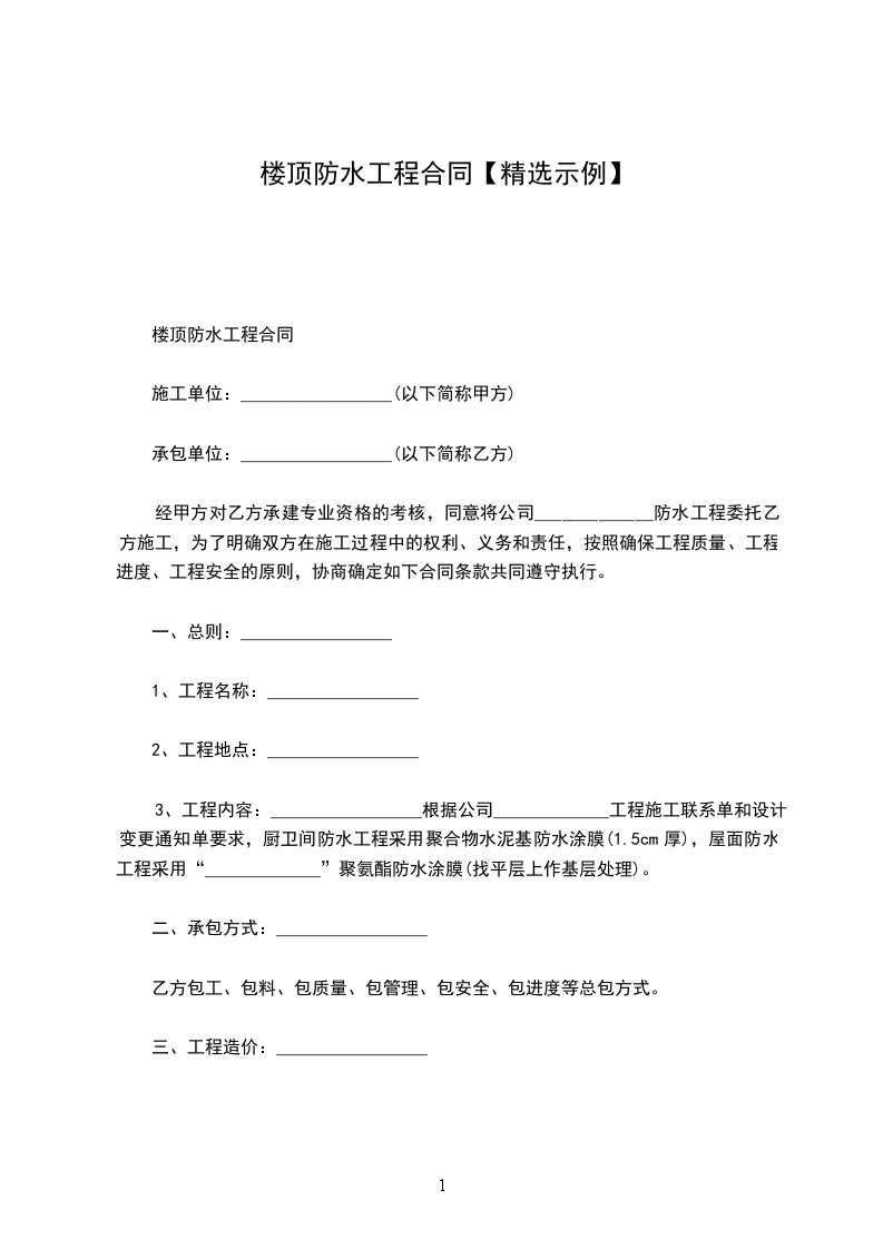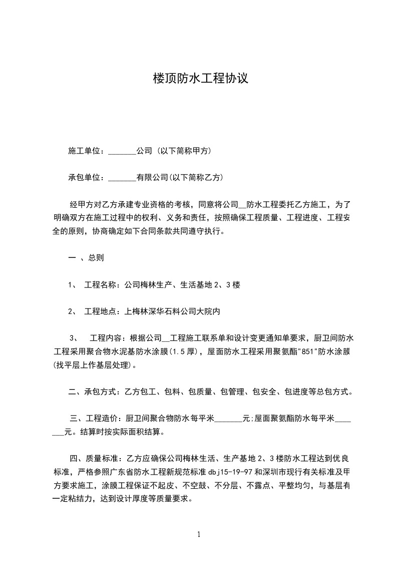 3、工程内容:_________________根据公司_____________工程施工联系单和设计变更通知单要求,厨卫间防水工程采用聚合物水泥基防水涂膜(1.5cm厚),屋面防水工程采用“_____________”聚氨酯防水涂膜(找平层上作基层处理)。