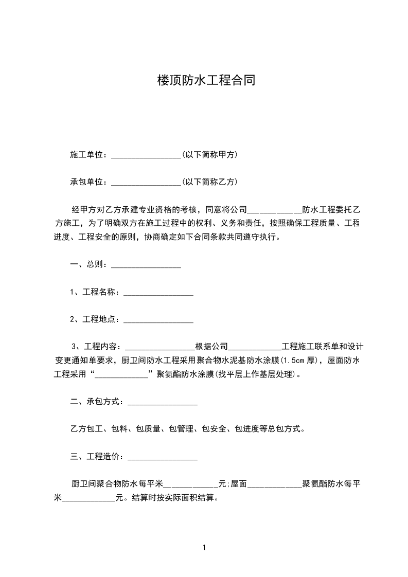厨卫间聚合物防水每平米_____________元;屋面_____________聚氨酯防水每平米_____________元。结算时按实际面积结算。
