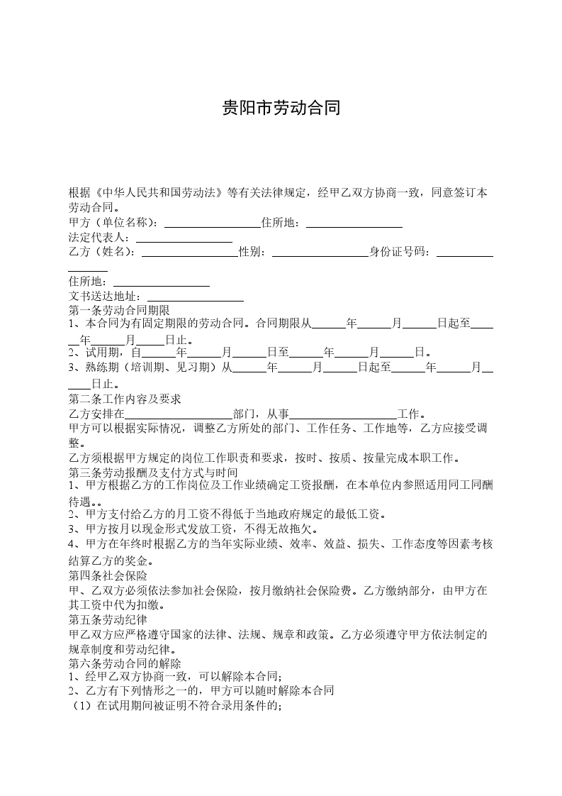 根据《中华人民共和国劳动法》等有关法律规定,经甲乙双方协商一致,同意签订本劳动合同。 甲方(单位名称):_________________住所地:_________________ 法定代表人:_________________ 乙方(姓名):_________________性别:_________________身份证号码:_________________ 住所地:_________________ 文书送达地址:_________________ 第一条劳动合同期限 1、本合同为有固定期限的劳动合同。合同期限从______年______月______日起至______年______月_____日止。 2、试用期,自______年______月______日至______年______月______日。 3、熟练期(培训期、见习期)从______年______月______日起至______年______月______日止。 第二条工作内容及要求 乙方安排在___________________部门,从事___________________工作。 甲方可以根据实际情况,调整乙方所处的部门、工作任务、工作地等,乙方应接受调整。 乙方须根据甲方规定的岗位工作职责和要求,按时、按质、按量完成本职工作。 第三条劳动报酬及支付方式与时间 1、甲方根据乙方的工作岗位及工作业绩确定工资报酬,在本单位内参照适用同工同酬待遇。。 2、甲方支付给乙方的月工资不得低于当地政府规定的最低工资。 3、甲方按月以现金形式发放工资,不得无故拖欠。 4、甲方在年终时根据乙方的当年实际业绩、效率、效益、损失、工作态度等因素考核结算乙方的奖金。 第四条社会保险 甲、乙双方必须依法参加社会保险,按月缴纳社会保险费。乙方缴纳部分,由甲方在其工资中代为扣缴。 第五条劳动纪律 甲乙双方应严格遵守国家的法律、法规、规章和政策。乙方必须遵守甲方依法制定的规章制度和劳动纪律。 第六条劳动合同的解除 1、经甲乙双方协商一致,可以解除本合同; 2、乙方有下列情形之一的,甲方可以随时解除本合同 (1)在试用期间被证明不符合录用条件的; (2)严重违反劳动纪律或者甲方依法制定的规章制度的; (3)严重失职、营私舞弊,对甲方利益造成重大损害的; 3、具有下列情形之一的,乙方可以随时通知甲方解除本合同 (1)在试用期内的; (2)甲方以暴力、威胁或者非法限制人身自由的手段强迫劳动的; (3)甲方未按照劳动合同约定支付劳动报酬或者提供劳动条件的; 4、因其它法律规定解除劳动合同,须提前三十天书面通知对方。 5、一方解除劳动合同,须提交相关证明材料,说明理由,并向对方书面送达解除劳动合同通知书。 第七条故意或者重大过失责任保证 如因乙方故意或者重大过失导致甲方发生经济损失,则乙方必须尽责处理善后事宜,挽回相应经济损失。甲方可以根据损失的大小及乙方的态度进行相应的处罚。 在本条事项未完全处理完毕之前,乙方不得擅自单方终止与甲方的劳动关系。原劳动合同期届满的,则相应顺延到本条事项处理完毕。 第八条商业保密及竞业禁止 1、乙方对在甲方工作期间所获悉的商业秘密,包括客户信息、相关资料不得以任何形式为自己或者他人进行使用,此保密期间不限于劳动合同期限。 2、乙方自双方劳动关系以任何形式结束之后,在两年内不得与甲方形成竞争关系,此条包括乙方本人或者帮助他人从事与甲方有竞争性的工作。 3、如乙方违反此条规定,则须向甲方赔偿万元违约金。 第九条违约责任 本合同如因一方当事人严重违背本合同约定条款而导致本劳动合同解除的,则须向对方承担违约金十万元。 第十条其他事项 1、乙方在甲方工作期间,由于经常接触甲方公章等印鉴,所有涉及乙方与甲方之间权利义务的法律文件,包括合同、证明、欠条等,均需由甲方法定代表人签字后才具有法律效力,未经法定代表人签字的一律无效,对此乙方完全同意并遵守,此条效力涉及本合同生效之前及之后。 2、甲方依法制定的规章制度、员工守则为本合同附件,与本合同具有同等法律效力。 3、通知:_________________如本合同本送达地址发生变动,乙方须及时通知甲方,否则甲方一旦按此地址送达,即视为履行了通知义务。 第十一条合同效力及文本 本合同自双方签字并加盖公章后即具法律效力。合同文本一式三份,双方各执一份,报劳动管理机关备案一份。本合同甲方加盖骑缝章。 甲方:_________________ 法定代表人:_________________ 乙方:_________________ 合同订立日期:_________________ ________年____月____日