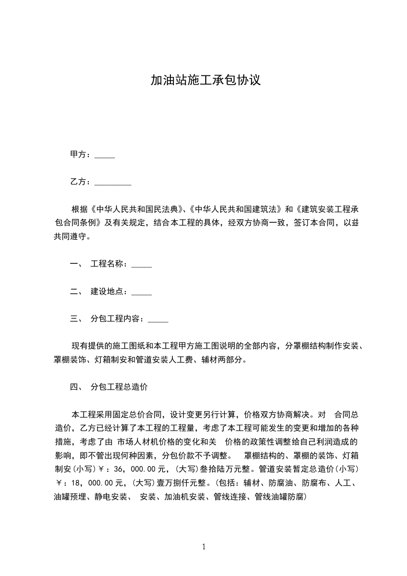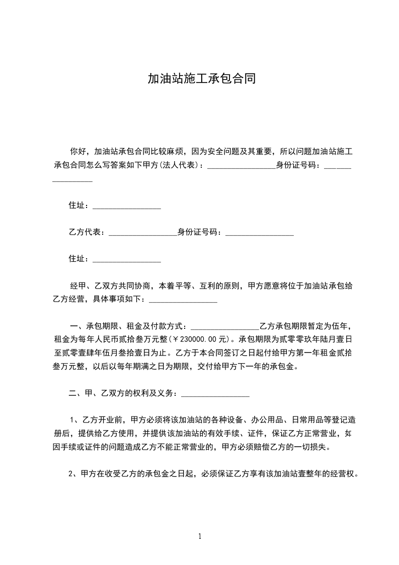 你好,加油站承包合同比较麻烦,因为安全问题及其重要,所以问题加油站施工承包合同怎么写答案如下甲方(法人代表):_________________身份证号码:_________________