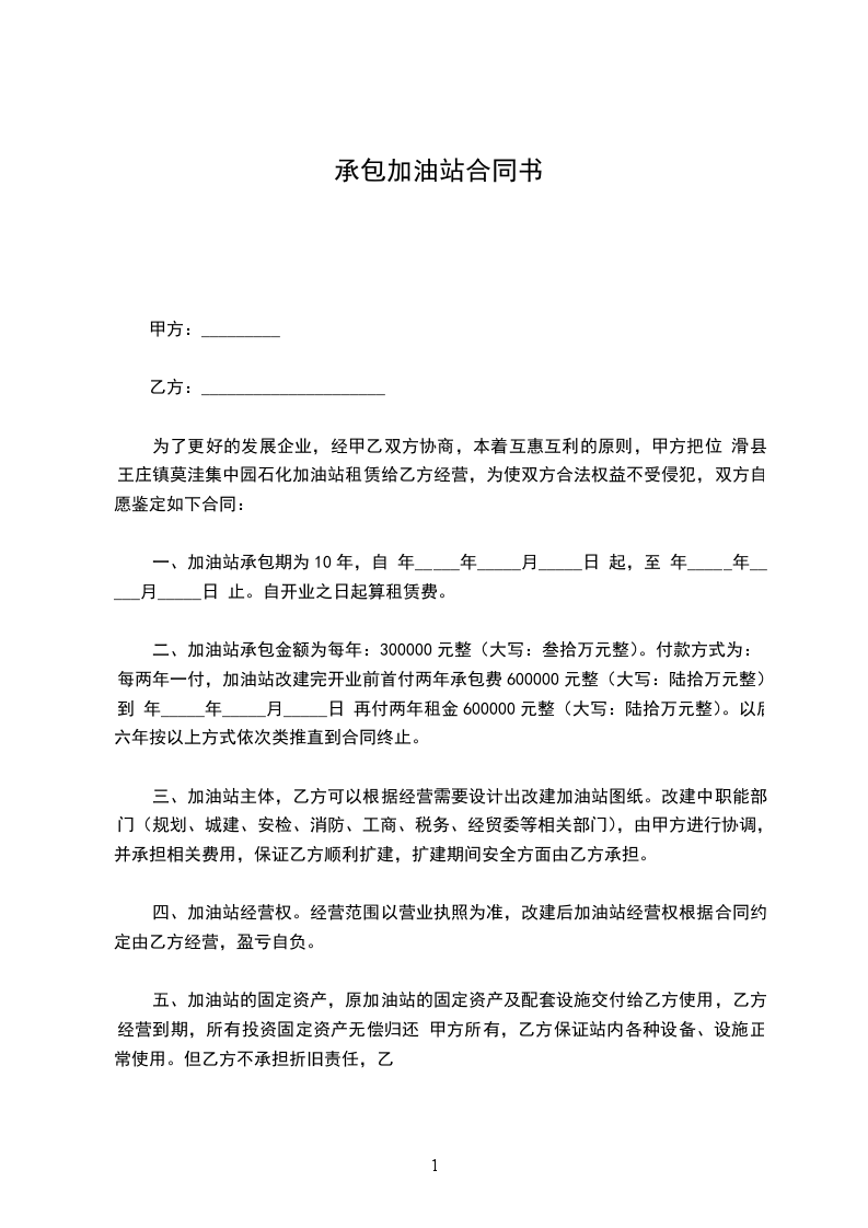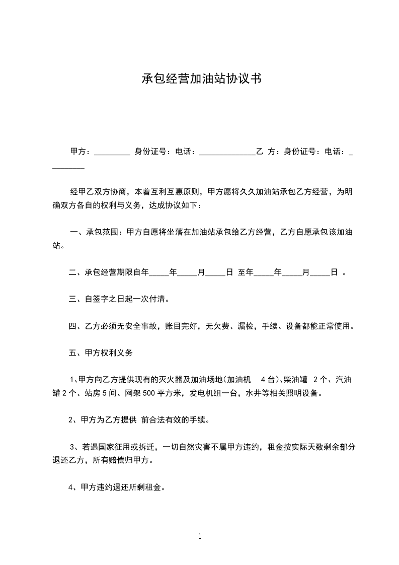 经甲、乙双方共同协商,本着平等、互利的原则,甲方愿意将位于加油站承包给乙方经营,具体事项如下:_________________