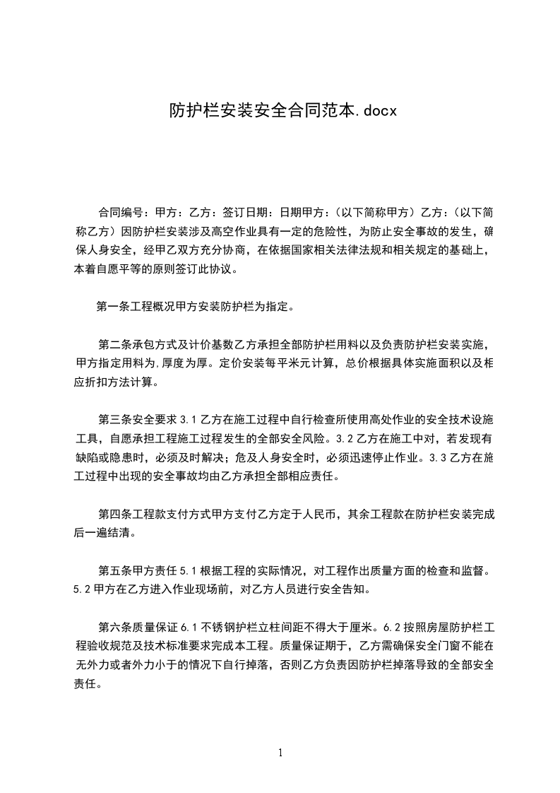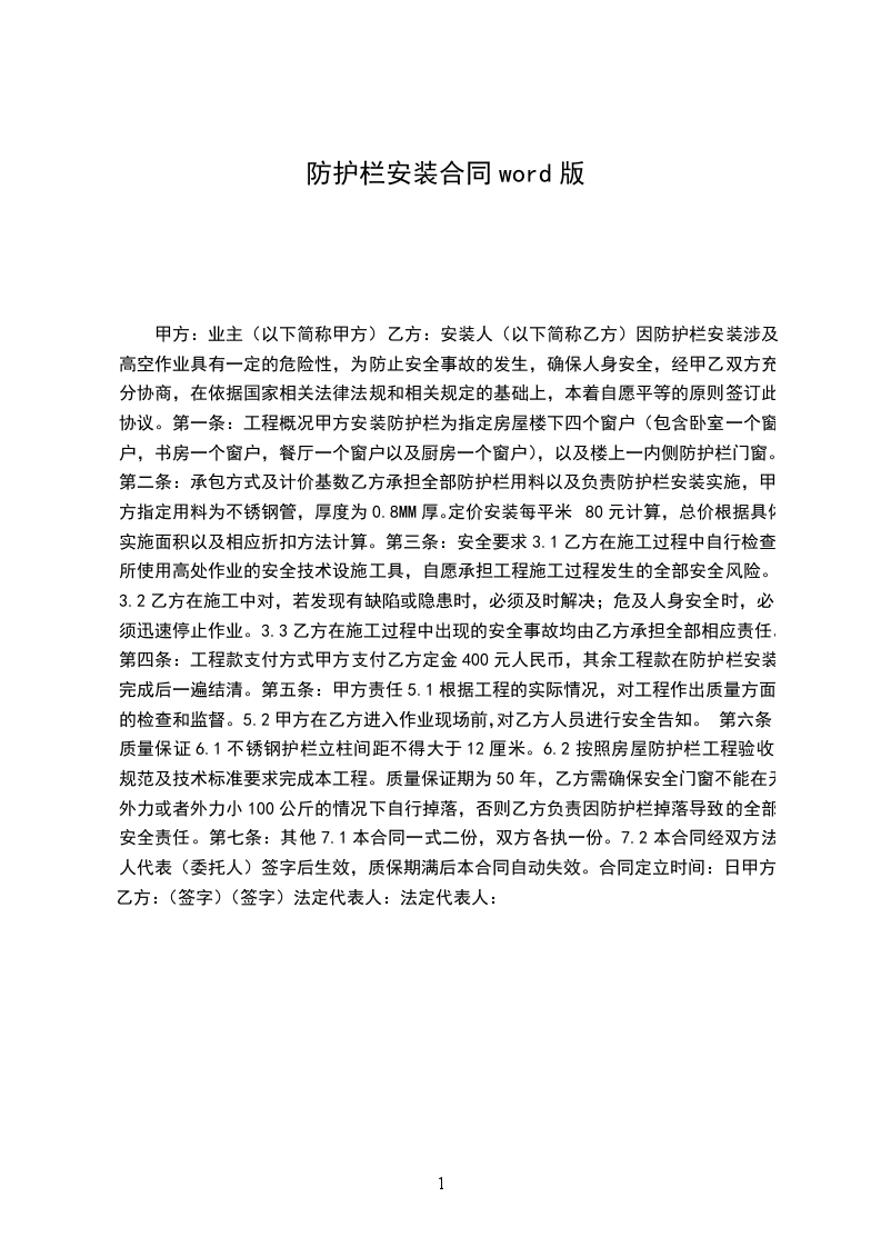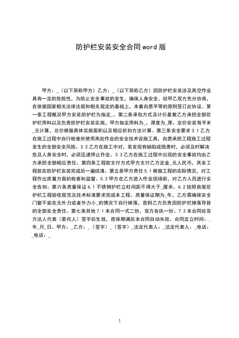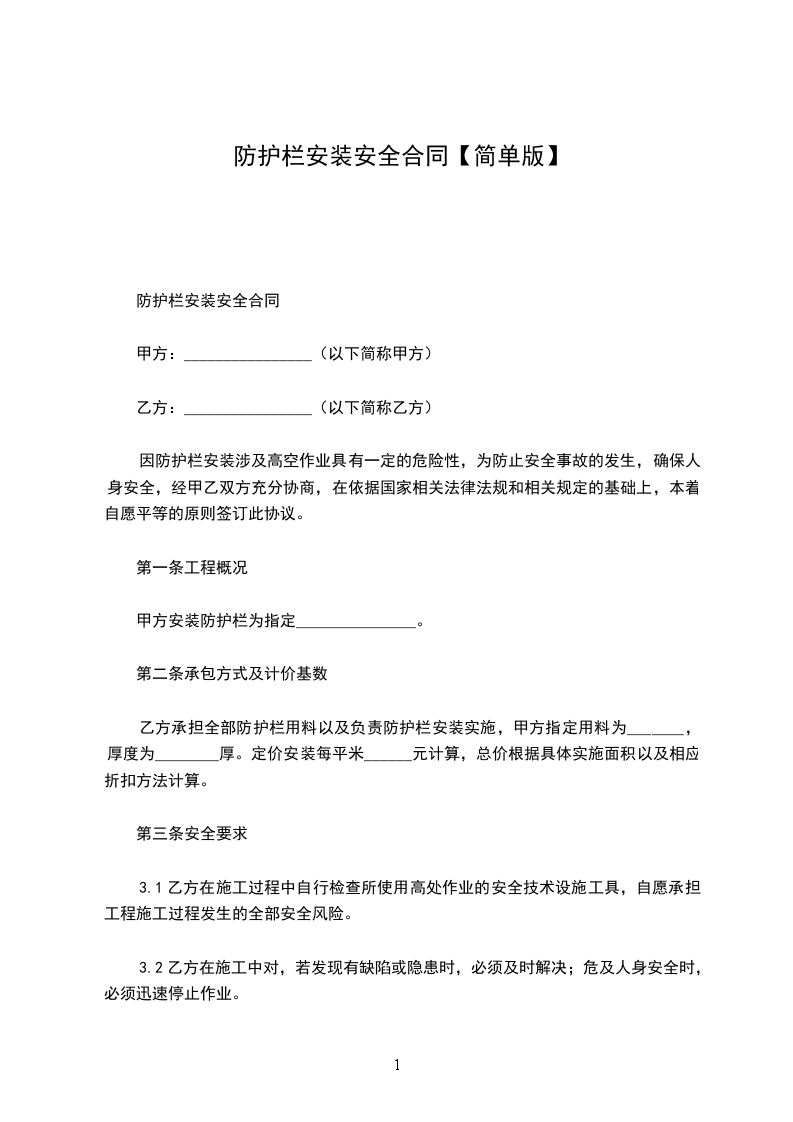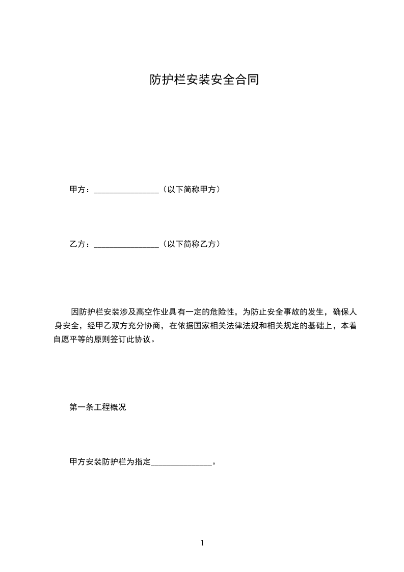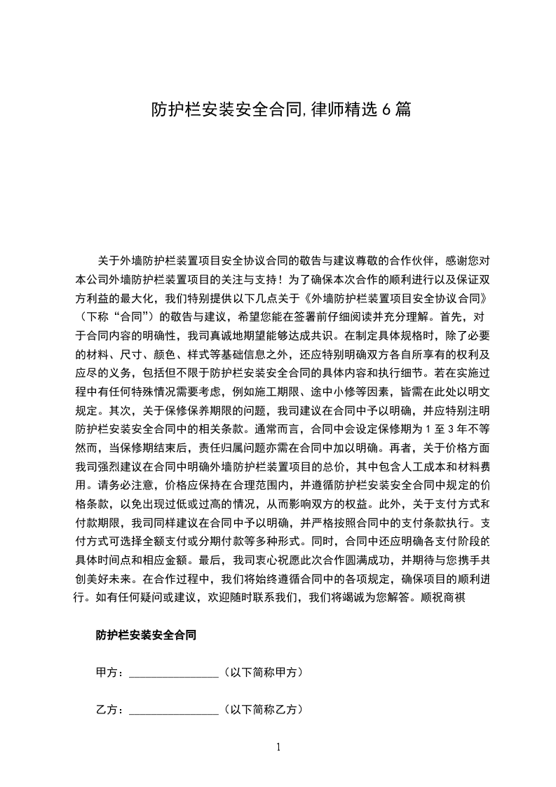 因防护栏安装涉及高空作业具有一定的危险性,为防止安全事故的发生,确保人身安全,经甲乙双方充分协商,在依据国家相关法律法规和相关规定的基础上,本着自愿平等的原则签订此协议。
